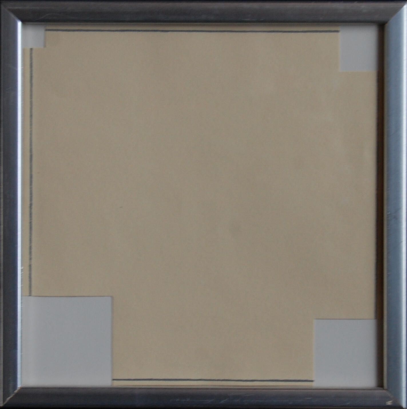 A square of paper with a narrow black outline at the outer edge has a square cut from each corner. The comer squares are of different sizes. The cream colored paper is placed in front of a white backing which shows in the areas cut away.Artwork Details