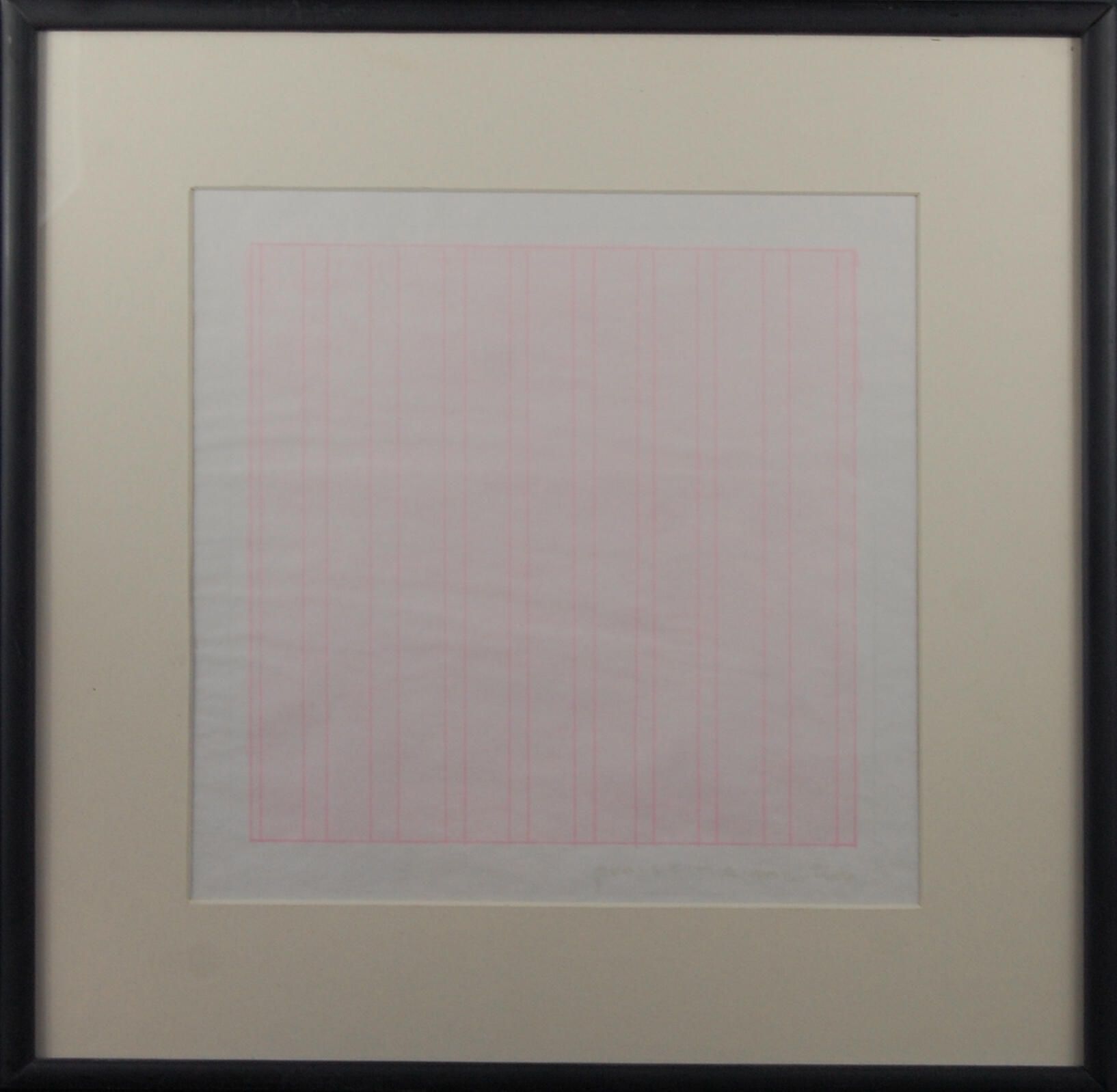 This print is composed of a series of wide and narrow pink stripes that are delineated with darker pink outlines enclosed in a square grid.