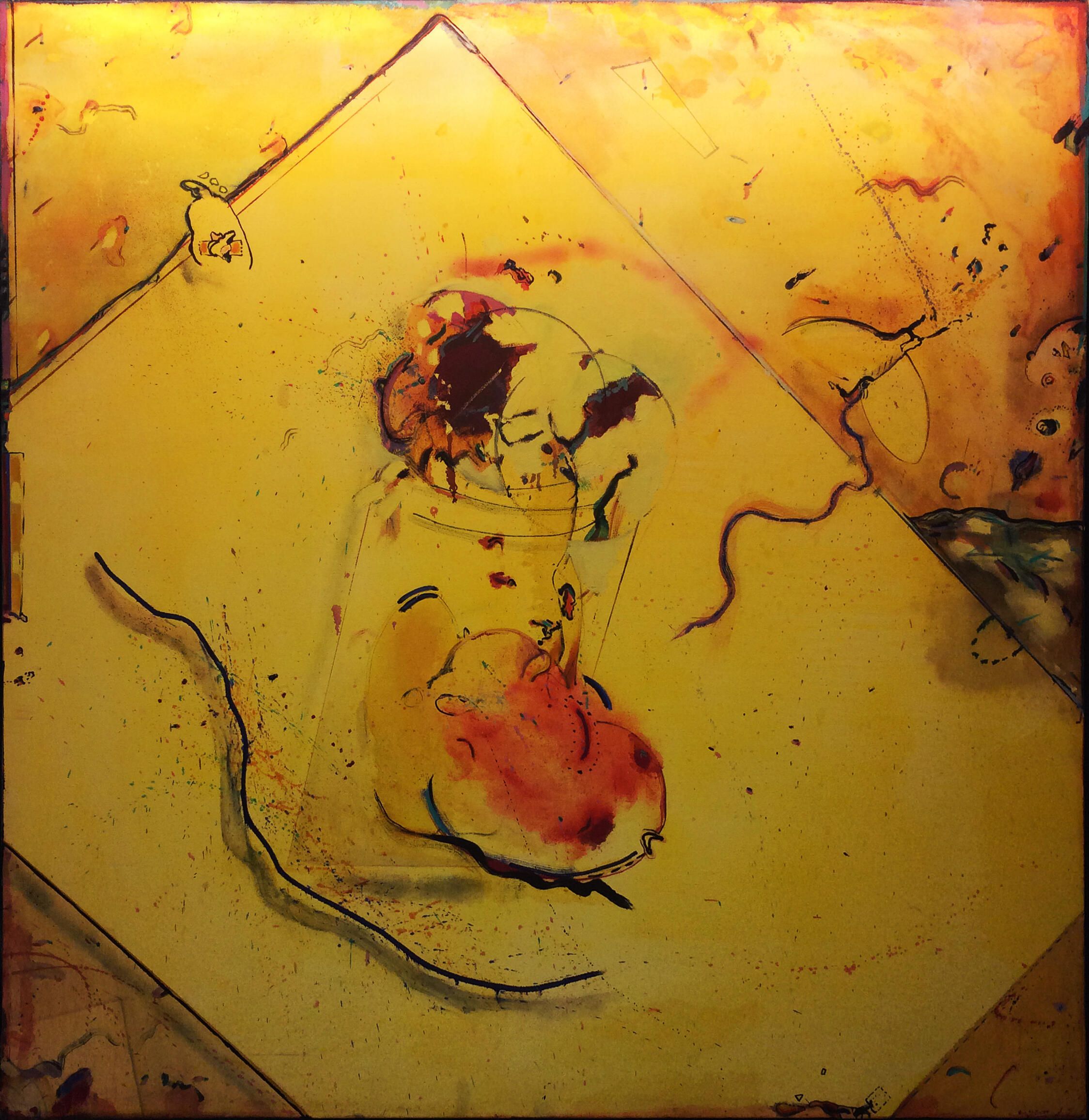 On a ground of yellow, the artist has outlines in red and black a rectangle set at an angle onto which she has painted biomorphic forms in red and black. Below the forms, a long dark filament, with its shadow beneath moves in an arc through light splashes of different colored paint. Opposite the curved filament is a black line with a reddish aura that moves out of the rectangle into the top right of the canvas. In each corner of the yellow ground are washes of red tones and black and red abstract forms.Dimensions