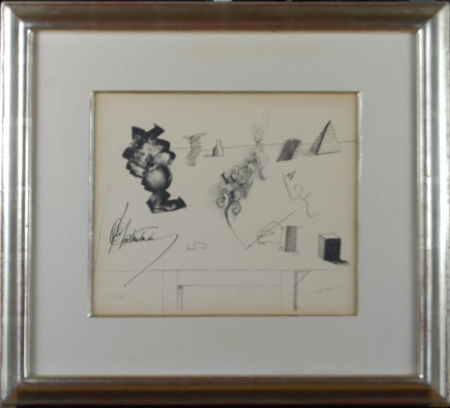 The imagery in this work is typical of Steinberg's prints that often include seemingly random images. This work appears as a still life on a drawing tabletop. The pyramids in the back right are common imagery for Steinberg. This work also includes a cube, a hand that is drawing, a scrawly illegible signature, a cyclone, a bottle etc. Each item appears to be separate from the others thematically.Made/Created