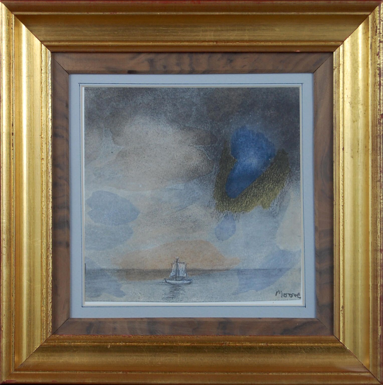 A small sailboat in white sits on a blue body of pale blue water under a sky that is composed of washes of blue, grey and peach. In the upper right comer is a large dark cloud with a deep blue center.Artwork Details