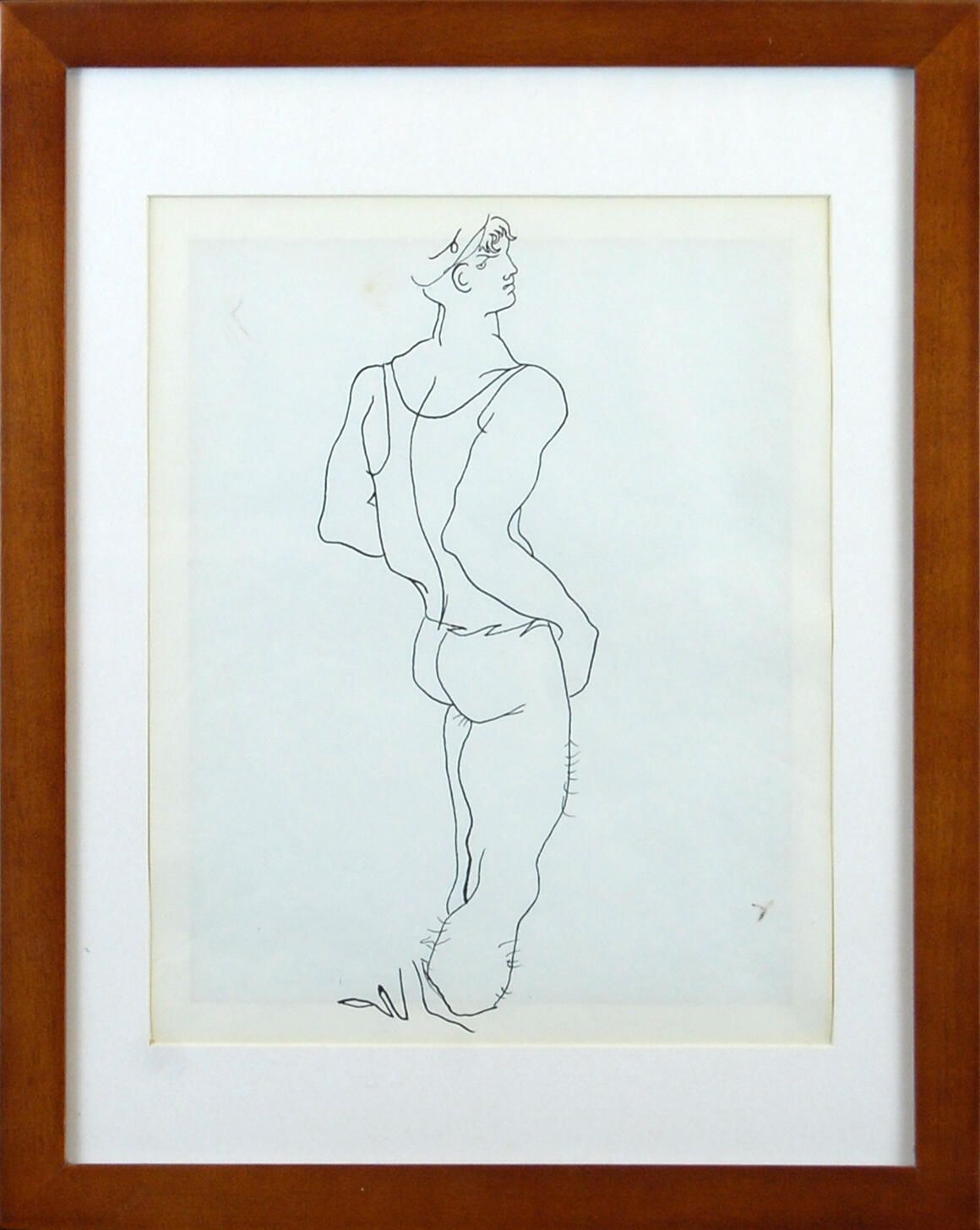 Cocteau has depicted in simple lines a character from the text of Querell de Brest wearing a shirt. The wisps of hair on his legs indicate that they are bare. While his body faces away from the viewer, he looks backward arrogantly over his shoulder so that his face is in profile. Wisps of hair show under a cap.Dimensions
