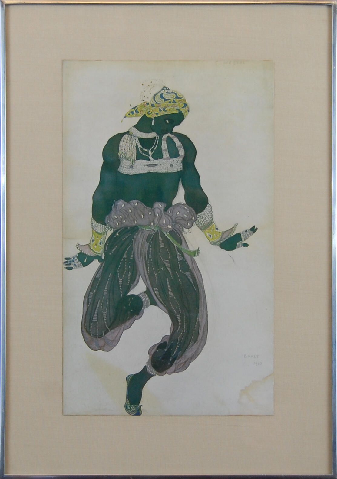 Elaborate costumes were designed by Bakst for the "5 negros" in the ballet. In the coloring of this image, the skin of the figure has been rendered green with translucent silver pantaloons and a yellow-green patterned headscarf and wristlets.Artwork Details