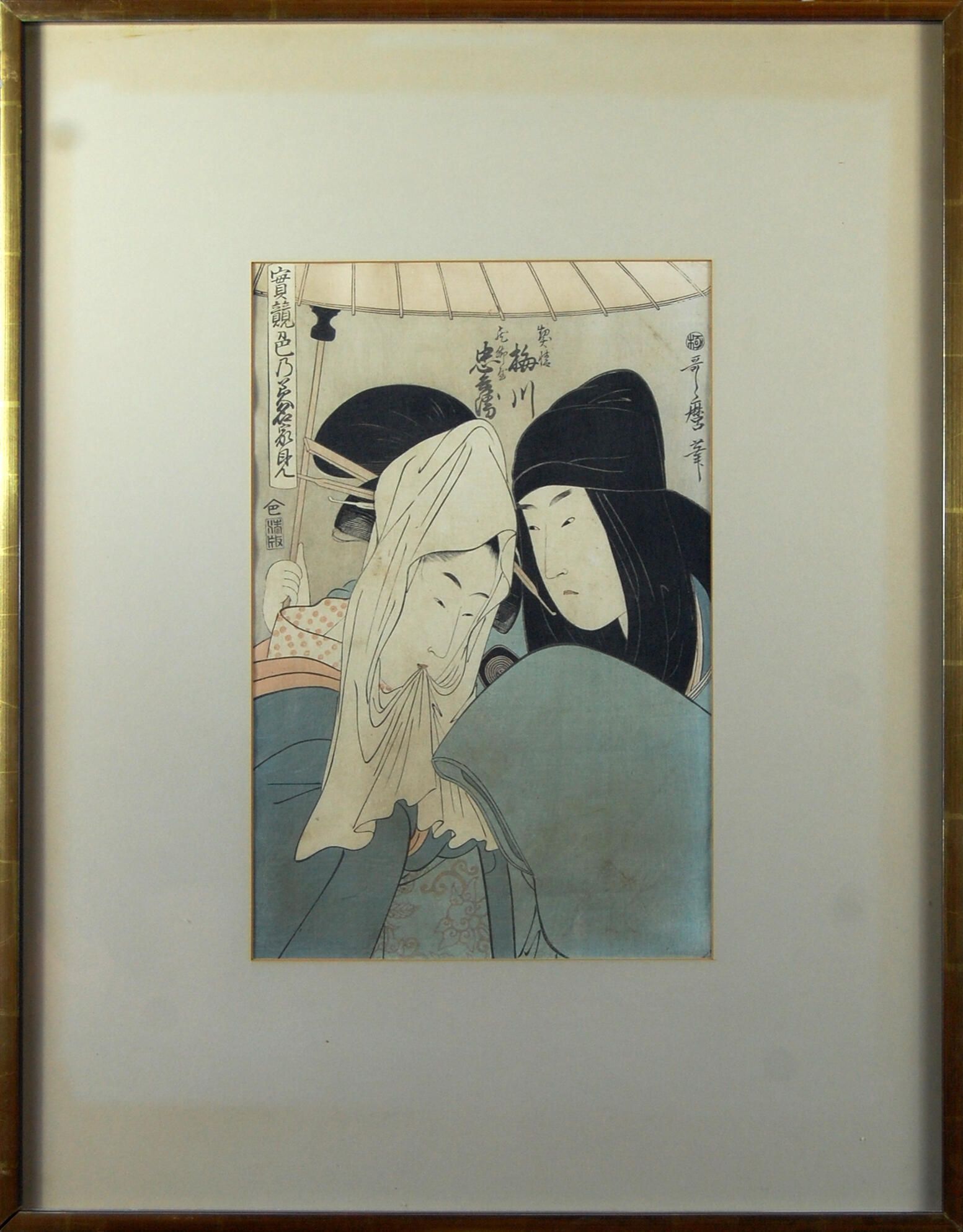 A man wearing a black head covering and the courtesan whom he loves are shown with their heads together under a partially visible umbrella. She has a scarf over her head with one end touching her lips. The head coverings are meant to disguise their identity while the two famous lovers, Chubei and Unegawa are on a journey to Chubei's hometown ofNinokuchi. Typical of the period, this work is part of a romantic story of a couples whose love is opposed by society and they face insurmountable problems. The couples, unable to legitimize their love choose to die together; double suicides were the outcome of these tragedies. The faces of the figures are not meant to be likenesses but to convey the emotion of their desperation.Artwork Details