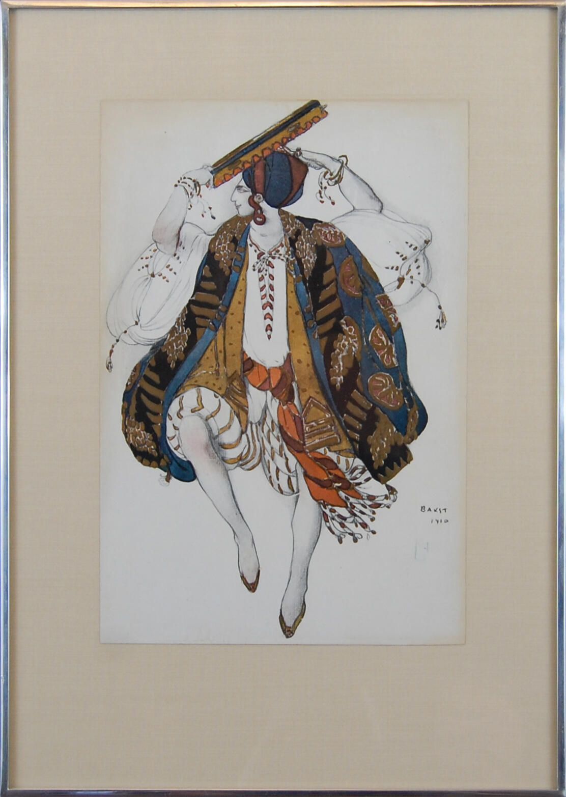 This hand-colored costume design sketch details the clothing designed by Bakst for the Jewish dancer in the ballet impresario Sergei Diaghilev's production of Cleopatra Ballet Russes- Judaica. It shows the dancer from the front with a flat hat attached to a scarf on the figure's head shown in profile. A billowing cape of teal and gold covers a gold-toned jacket, The figure wears striped puffy pantaloons.Artwork Details