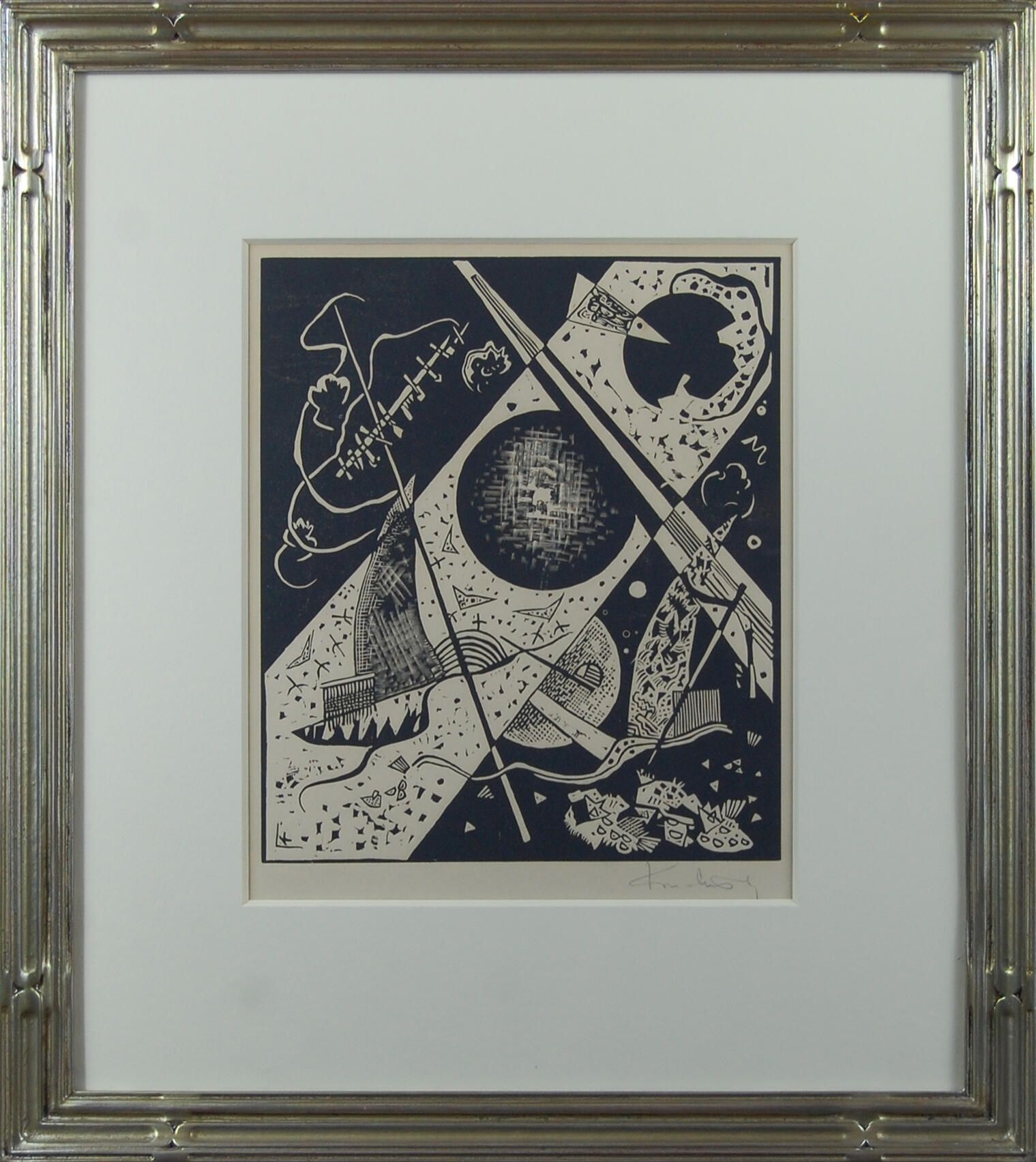 Using abstract forms, many of which appeared in his early paintings, Kandinsky's composition uses perspective to draw in the viewer. The top left third and the bottom right part of the composition are black with white forms that float above. The same forms cross the center area but are now black in contrast to the white (of the paper) background. A long narrow triangle that crosses all three spaces narrows as it moves upward, defining the depth of the space. Other shapes, such as the curving white line at the top of the image recall the blue rider in one of Kandinsky's earliest abstracts.Artwork Details