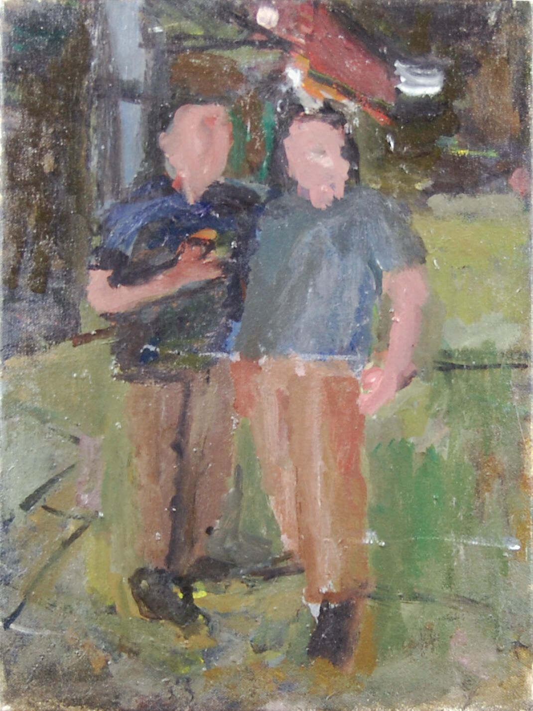 This gestural painting was executed in an Expressionistic style typical of the artist. It features two partially abstracted figures in the center of the composition standing on a street in what appears to be evening. A red awning and doorways compose the background. The ground is composed of blocks of mottled colors, divided like a sidewalk. Also typical of the artist, the painting is rendered in blended, muted and darker colors.Dimensions