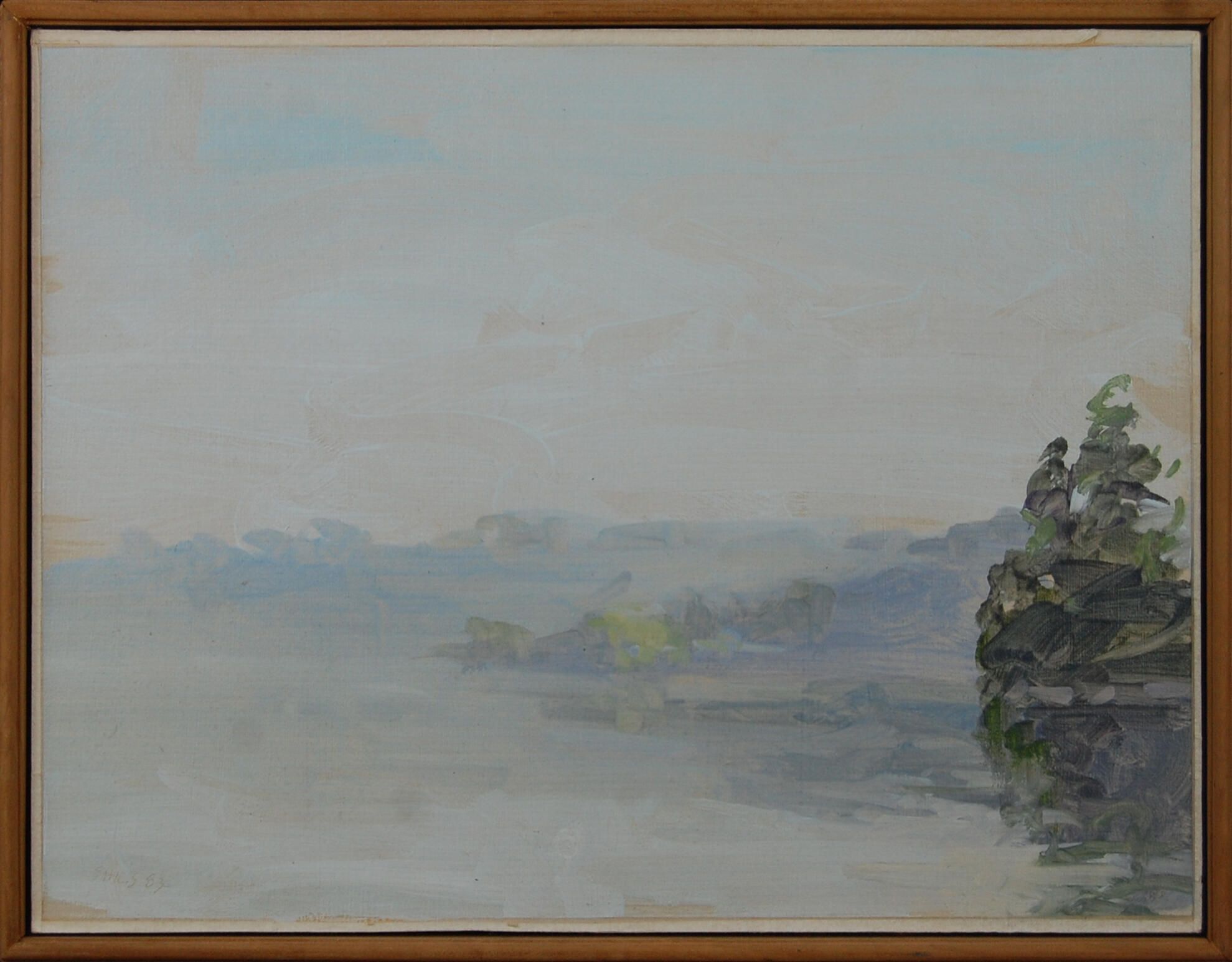 In soft layers of blue, rose, lavender, etc., Shils depicted a jut of land extending into the water from the right side of the image. A large dark green tree is shown on the far right. A mist hangs over the water, land and sky.Artwork Details