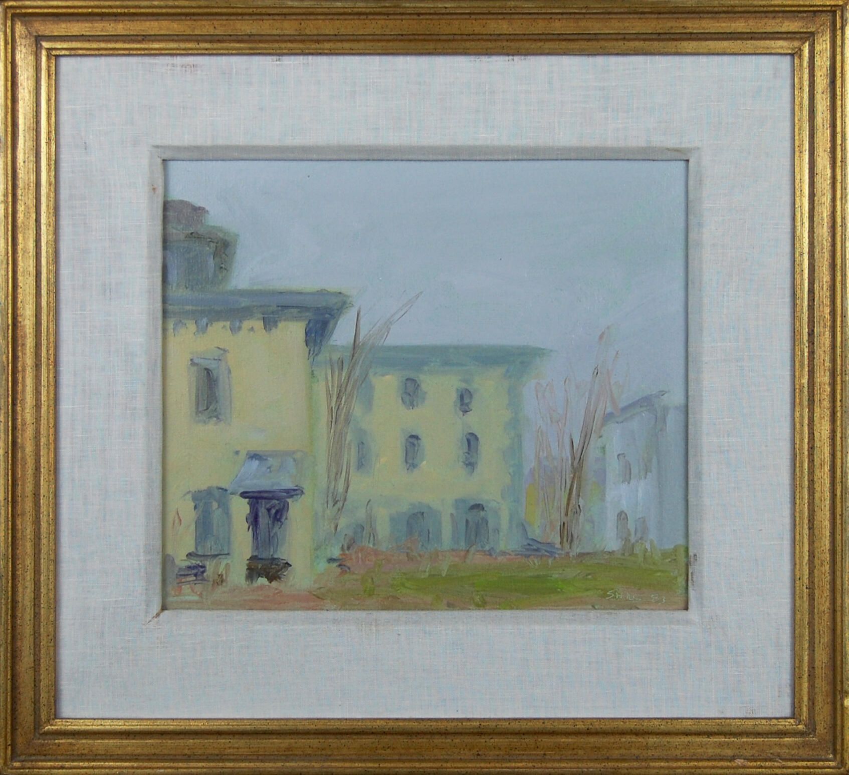 Two yellow Italianate buildings are depicted with loose brushwork on the left side of the image next trees with bare branches. The grey and white building on the right was loosely sketched in with paint.Dimensions