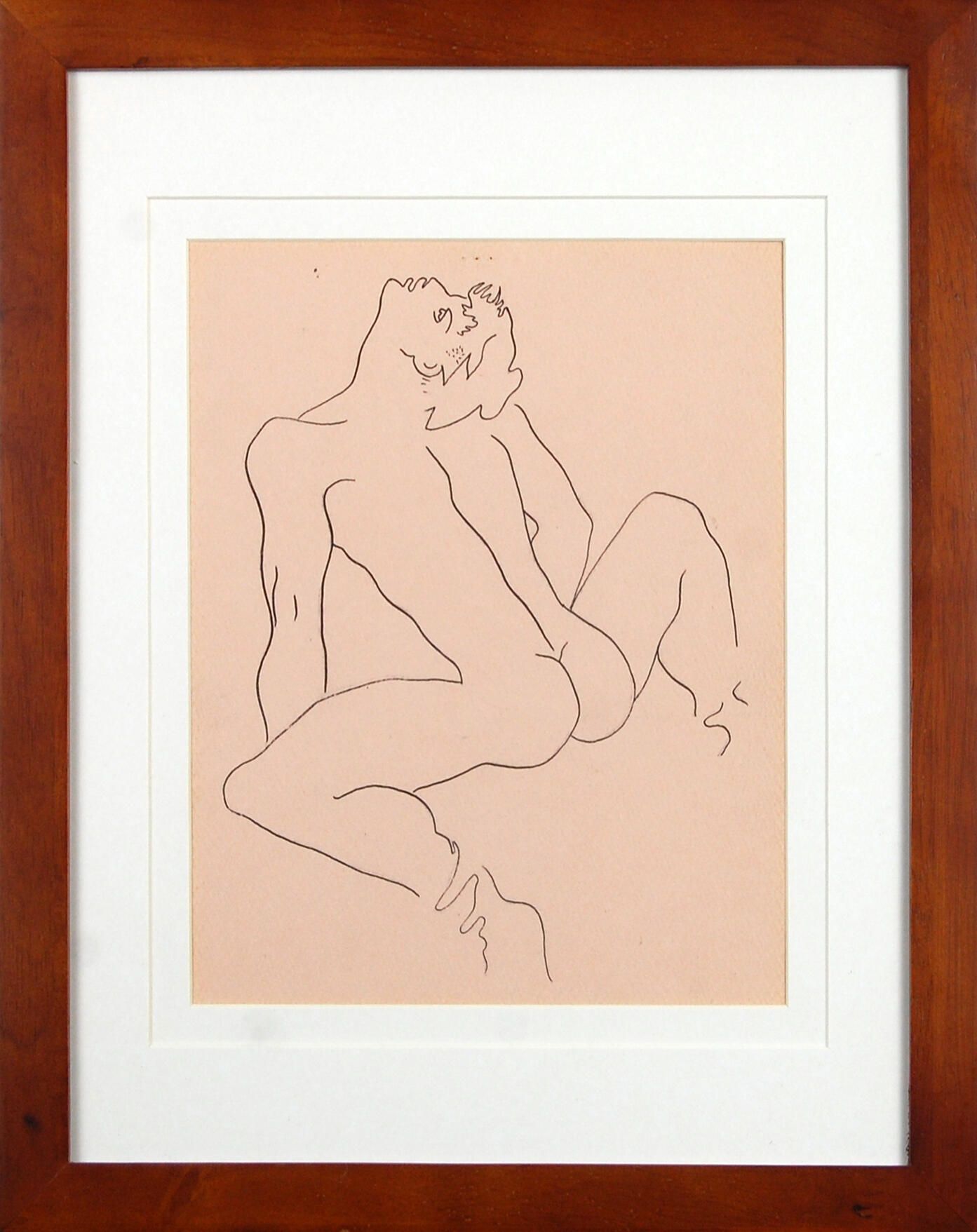 Description: This line drawing of a nude man facing away from the viewer but with his head tilted backward is shown against a pale peach-pink ground.Dimensions