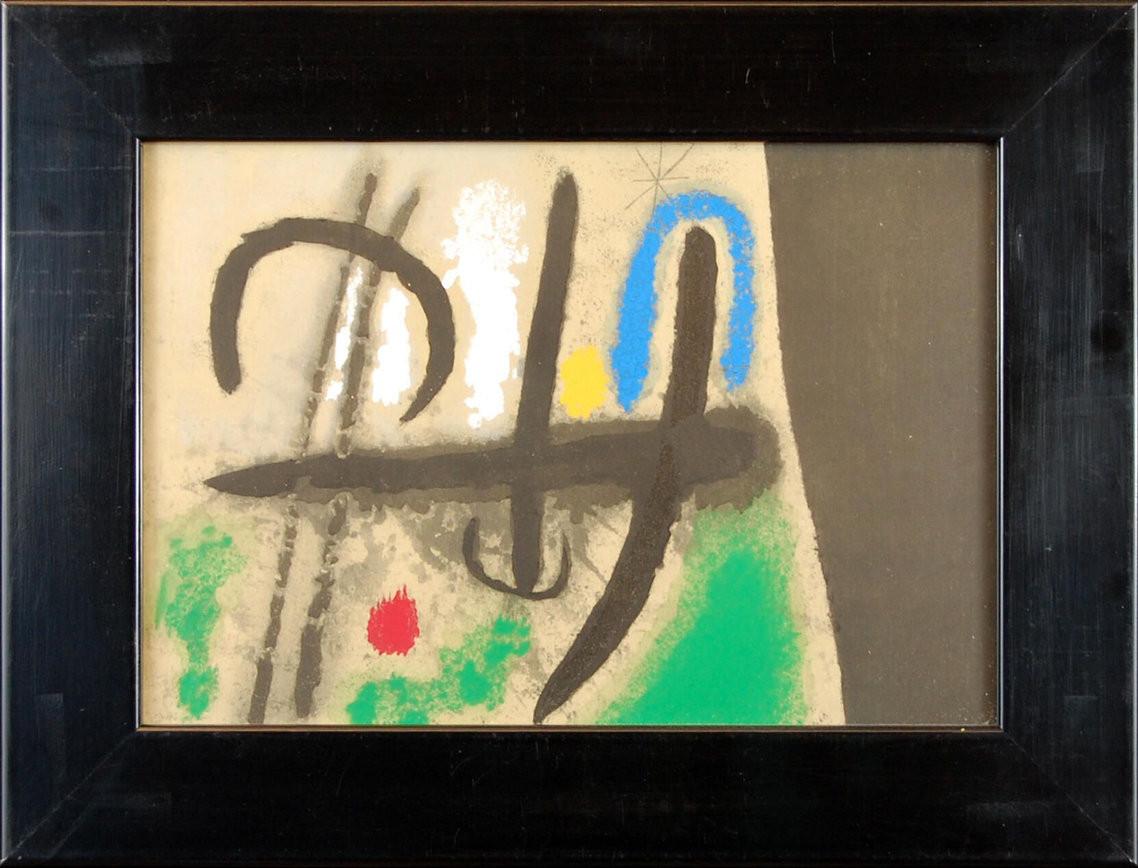 The group of prints is composed of four vertical and three horizontal prints in colors typical of Mir6's works: green, red, yellow, blue, yellow and black. The abstract, biomorphic forms in the prints loosely refer to images of a person and a bird interacting. The images were printed using a stencil process on tan paper.Dimensions