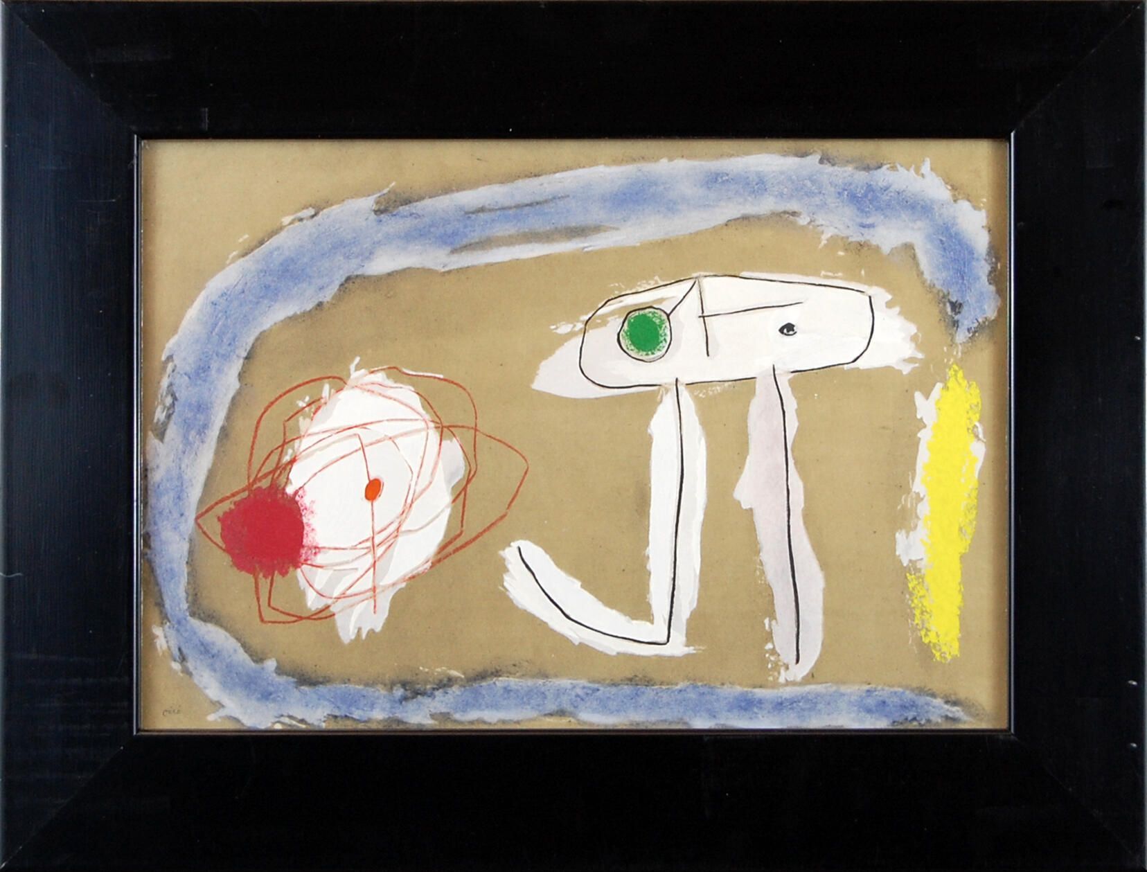 The group of prints is composed of four vertical and three horizontal prints in colors typical of Mir6's works: green, red, yellow, blue, yellow and black. The abstract, biomorphic forms in the prints loosely refer to images of a person and a bird interacting. The images were printed using a stencil process on tan paper.Dimensions