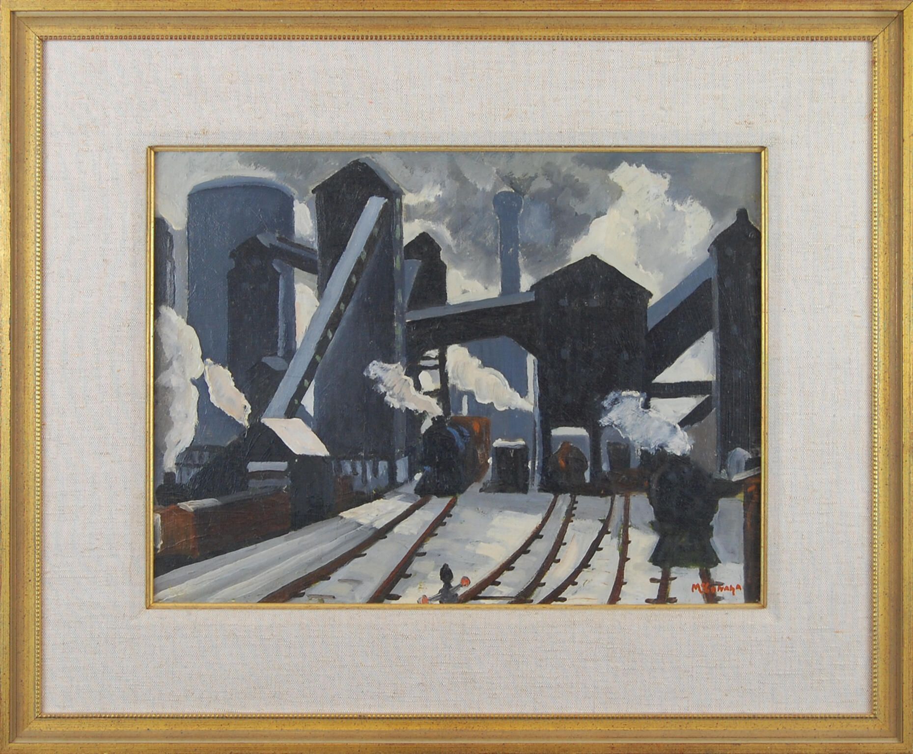 The artist depicted a winter scene in an industrial landscape. As part of the Hoosier Salon, 1 McConaha painted scenes of Indiana. While many are of lush rolling landscape, others are of the people and the industry of the state. McConaha also captured seasonal changes in the landscapes of his native state. In this work he has used greys, white, with touches of dark red to create an industrial landscape with tall tanks, other industrial buildings, and tracks that lead from the foreground into the factory site. A small train car sits in the middle ground on the tracks. Billows of smoke indicate that this plant is operational.Dimensions