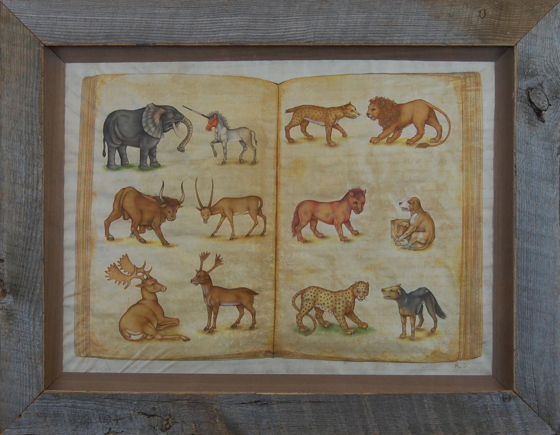 Painted on vellum are two pages that are made to appear, using trompe l'oeil imagery, as though they are in a large folio. There are six images of animals, some imagined, some more realistic, on each of the two golden-toned pages. Included in the group are a unicorn, a lion, a leopard, a bull and several antlered animals.Artwork Details