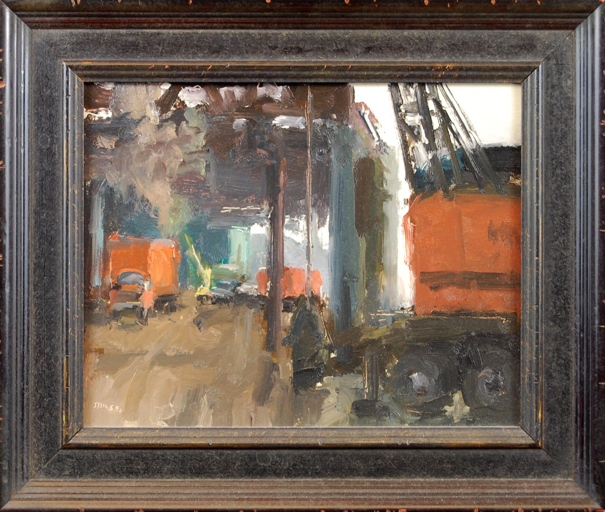 With heavy expressionist brushwork the artist depicted a construction site with trucks, machines and billowing smoke. An orange crane in the lower right is balanced by the orange panel truck in the rear left.Artwork Details