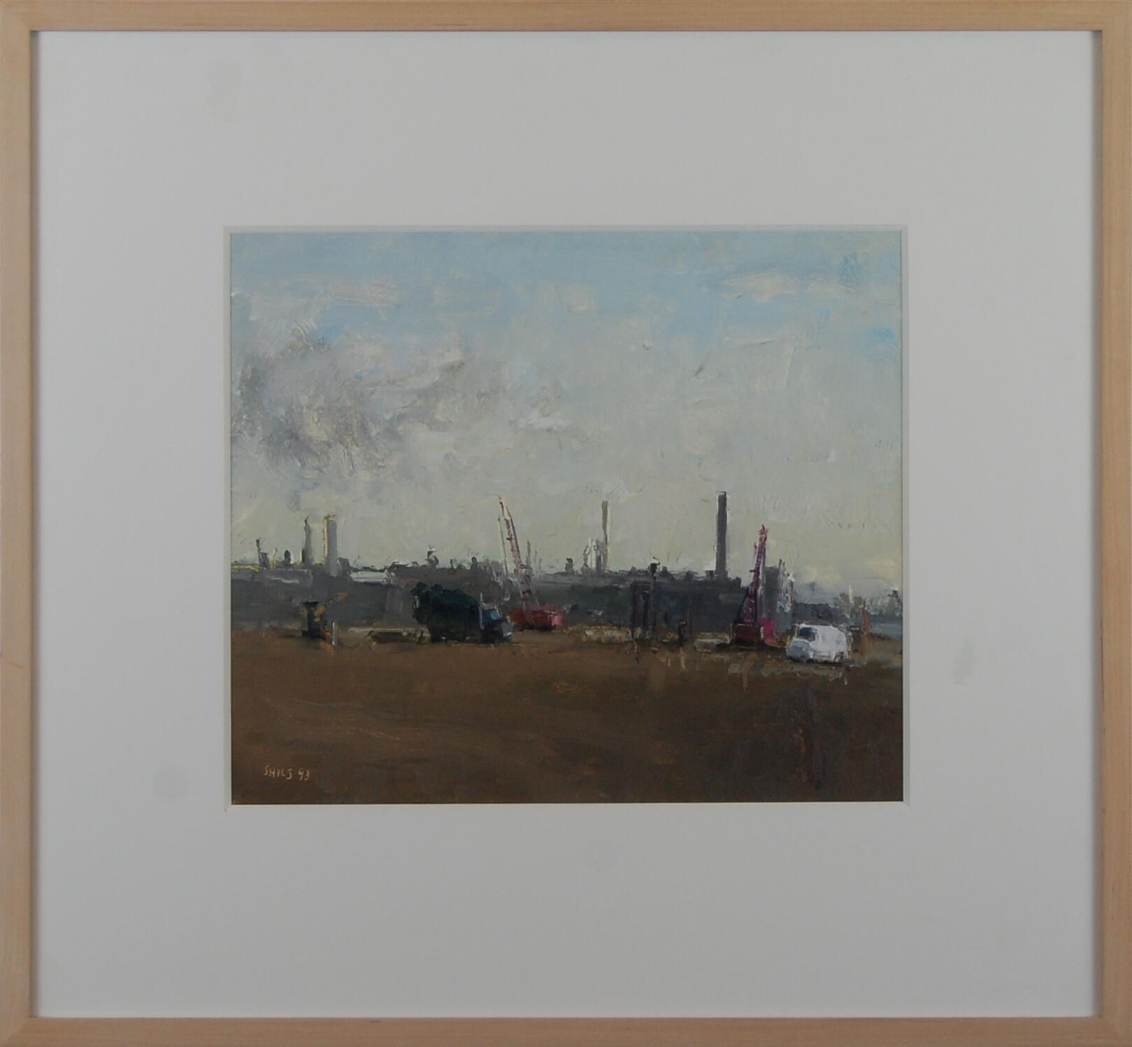 Shown from a distance, Shils painted a construction site on the horizon beyond bare soil. Various pieces of equipment have smokestacks and cranes shown against the pale blue sky that mingles with the grey smoke and white clouds. Panel trucks and vans are included in the image.Artwork Details
