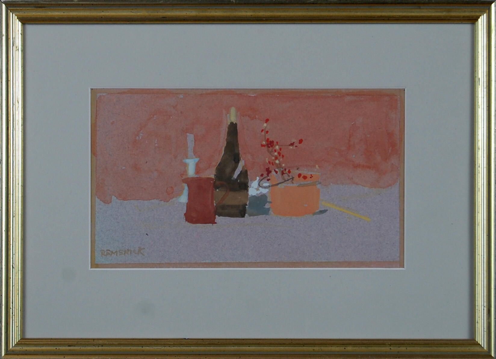 Against a pale pink lower ground and a coral-colored upper one, the artist has depicted several small objects including a tall dark bottle, a white candlestick with a candle, several additional small containers and red berries on branches.Dimensions