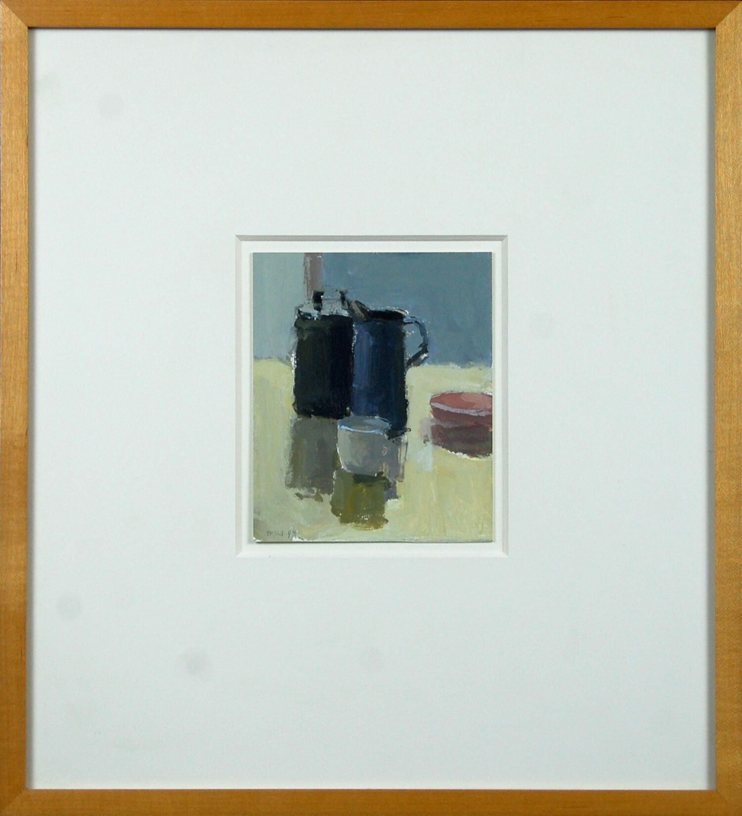 This still life includes a small pink dish, a cup and two pitchers on a yellow table with a blue-grey background above.Artwork Details
