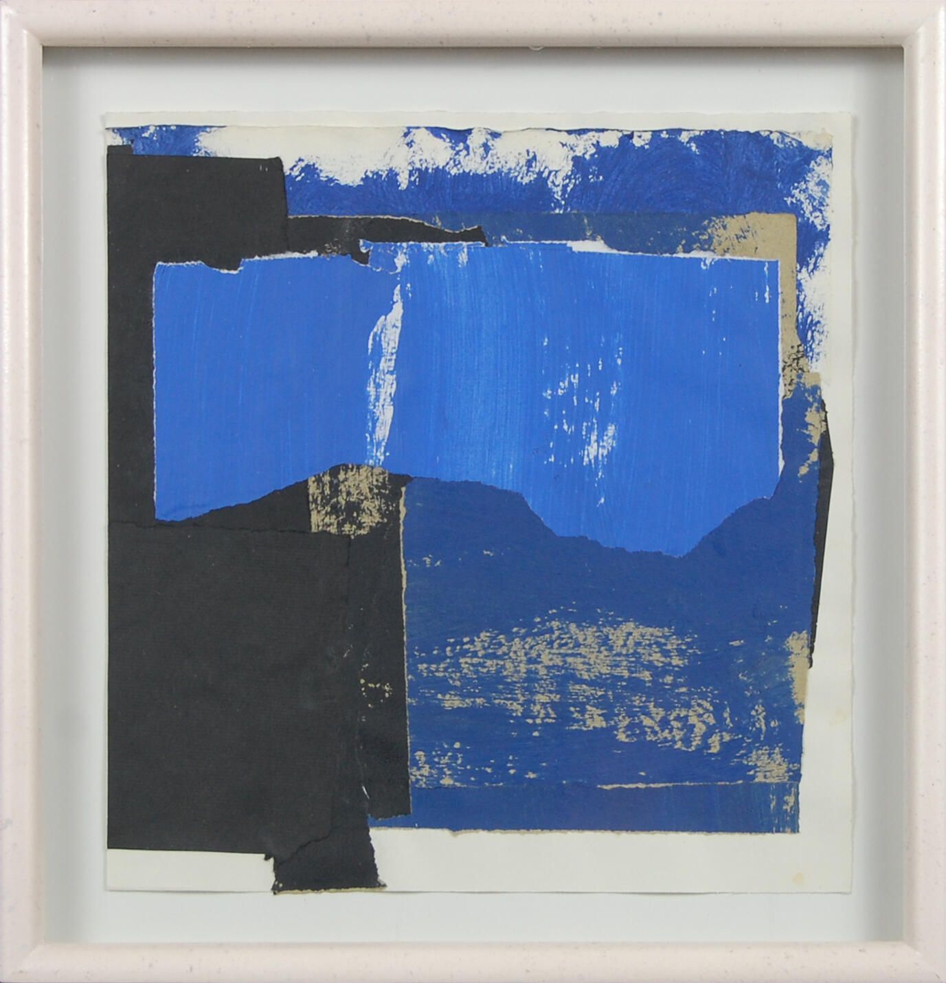 This abstract composition is a collage of torn and cut painted paper includes three major parts: tan paper painted black, white paper painted blue, and blue paint on tan paper.Dimensions