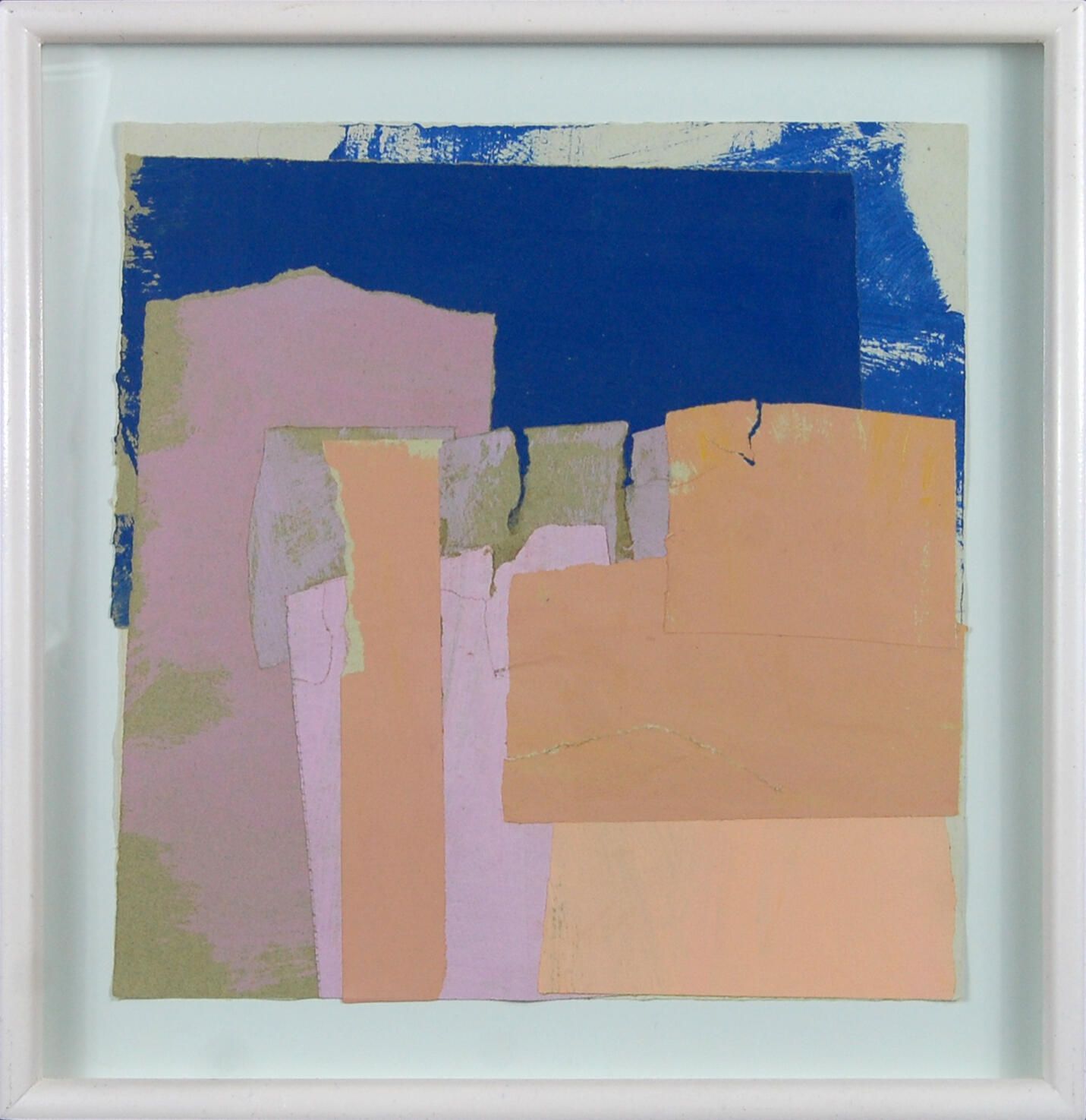 This abstract composition is a collage of torn and cut painted paper and includes several elements fit together: tan and white paper painted blue, pink and light and dark peach.Artwork Details