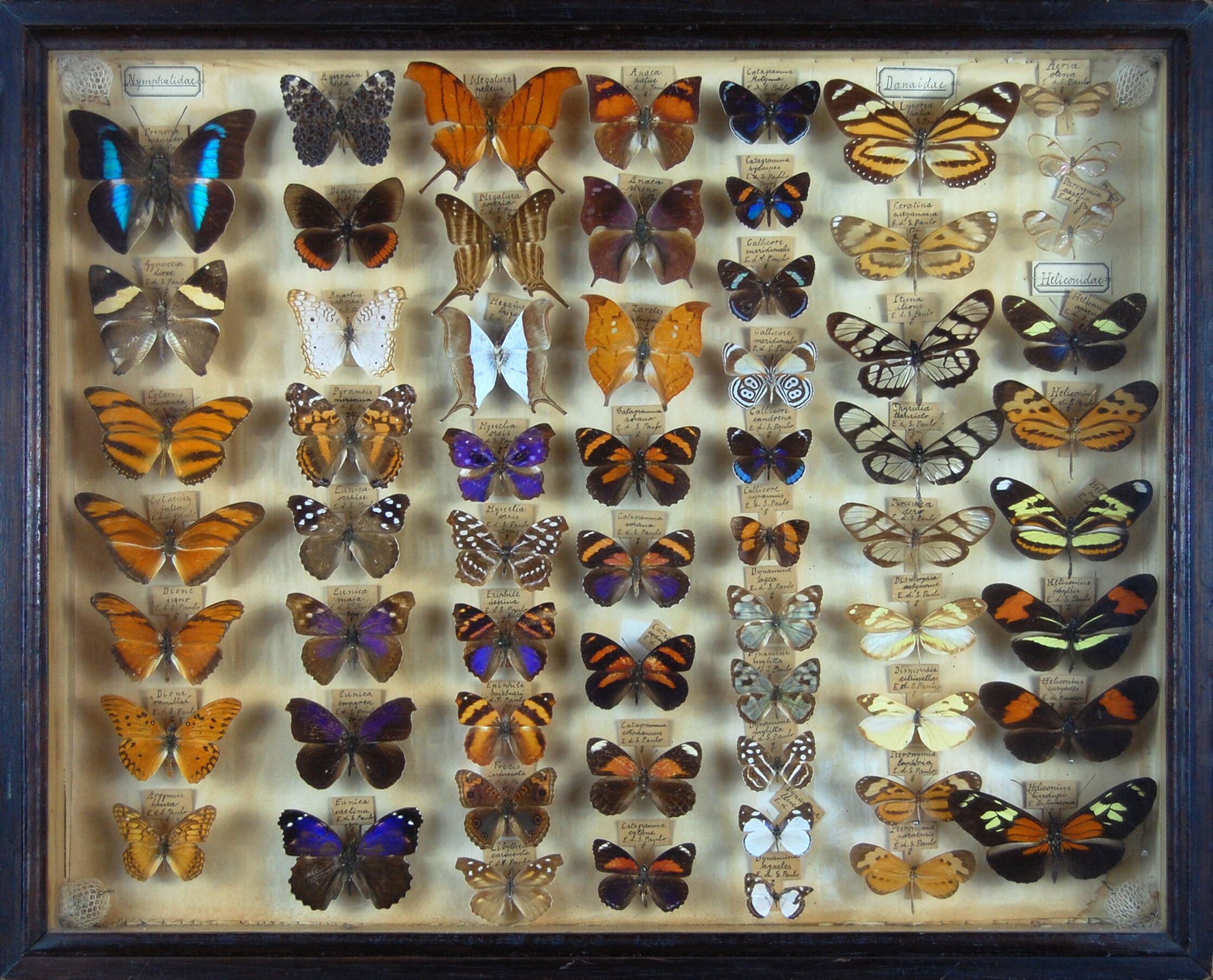 This shadow box includes 58 butterflied that have been mounted. Each has a hand- written label.