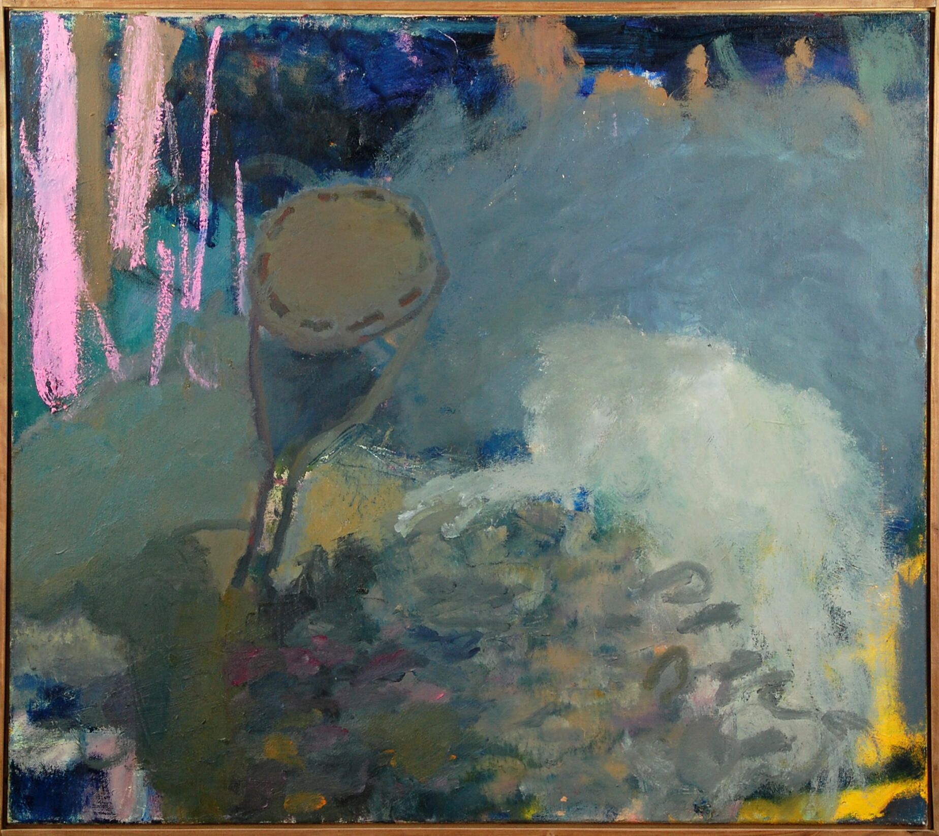 This abstract painting is composed of varying layered colors with the majority of the work in shades of blues and greys. Bright areas such as the pink series of lines in the upper left corner and bright yellow in the lower right comer are strong contrasts to the darker tones. The focal point in the image is the showerhead-like form in the upper left in brown shown against a muted blue ground. The artist's brush strokes are visible in the large areas of color.Dimensions