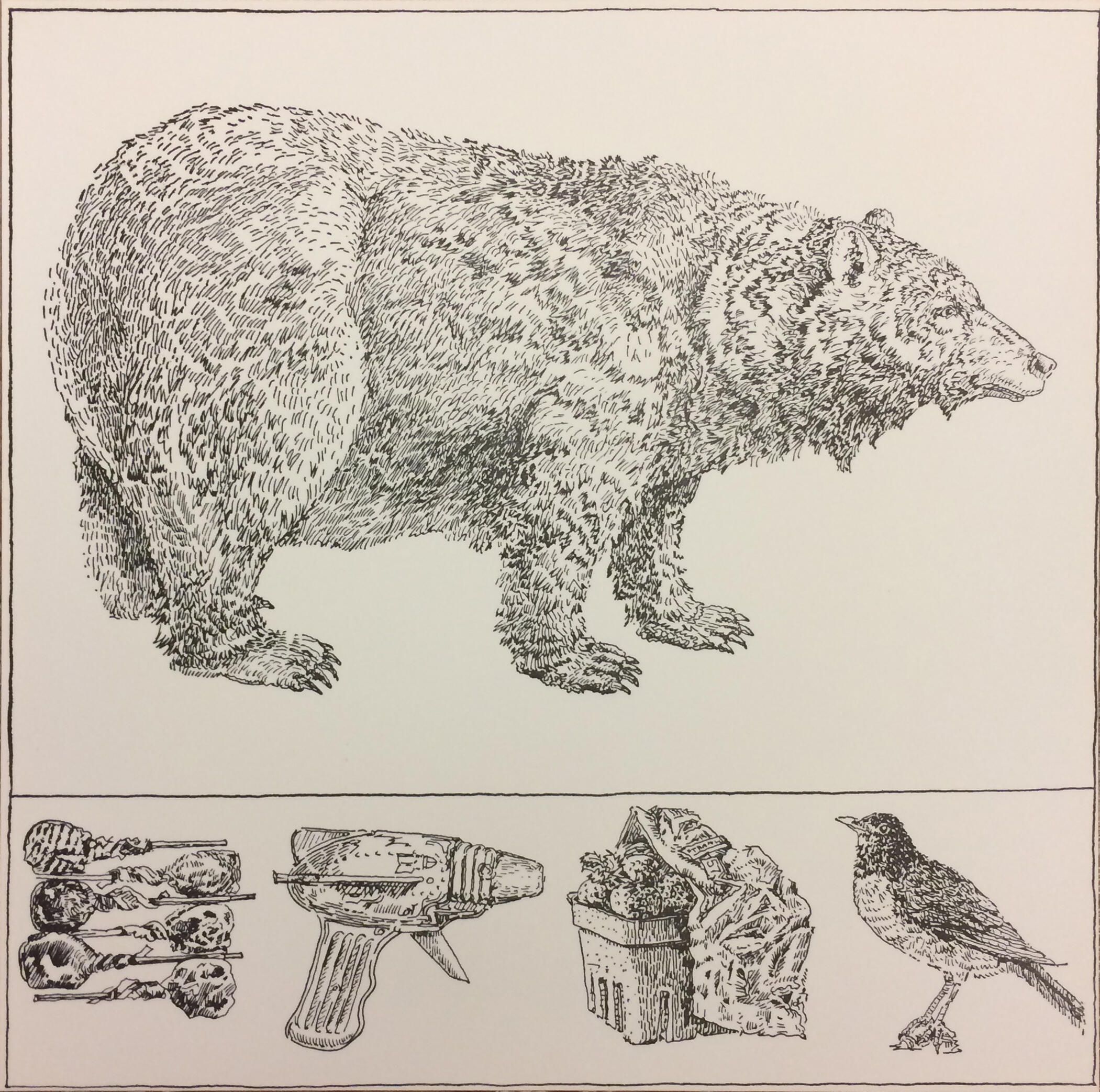 Using patterns of lines to describes the images in this print, Nice rendered the realistic image of a bear above with four images in the "predella" below. The bear stands in profile looking to the (viewer's) right. Below is a series of 5 Tootsie Pops (an image the artist used in other works), a toy ray or water pistol, a small basket of fruit with a cloth draped across it, and a bird, also shown in profile.Artwork Details