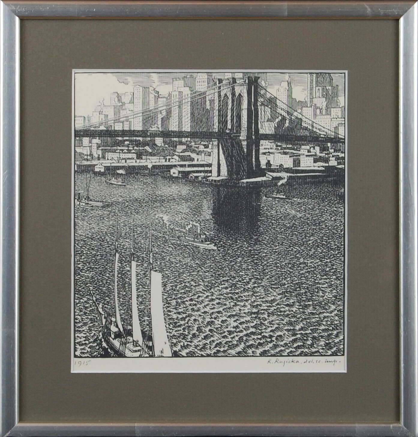 An early work by Ruzicka depicted a view of the Brooklyn Bridge in black and white from across the East River with New York City buildings in the background The central focus of the image, printed from a wood engraving is one of the stone towers from which the steel cables emanate in downward facing arcs. Several small boats move through the river under the bridge. Ruzicka placed a partially shown three-sail vessel in the lower left comer, a device which pulls the viewer into the image. This realistic portrayal uses the varied lines used in wood engravings to create textures such as hatching and grids adding shades of grey to the imagery.Dimensions
