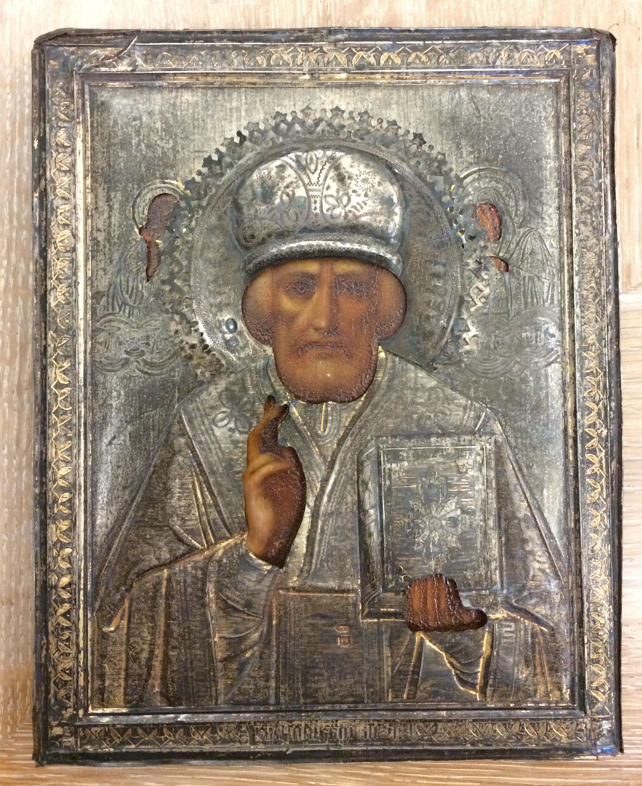 With a book in his left hand, Saint Nicholas holds up his right hand in a traditional blessing. I assumed that the full figure of the saint beneath the riza is not completely painted. 6 Only his face, hands and two angels to either side of his halo that show through the openings in the metal are painted on the panel. The riza covering the panel is worked with repousse providing details of the saint including those on his crown and vestments. The three- dimensional halo also has been added to reflect light for the saint.