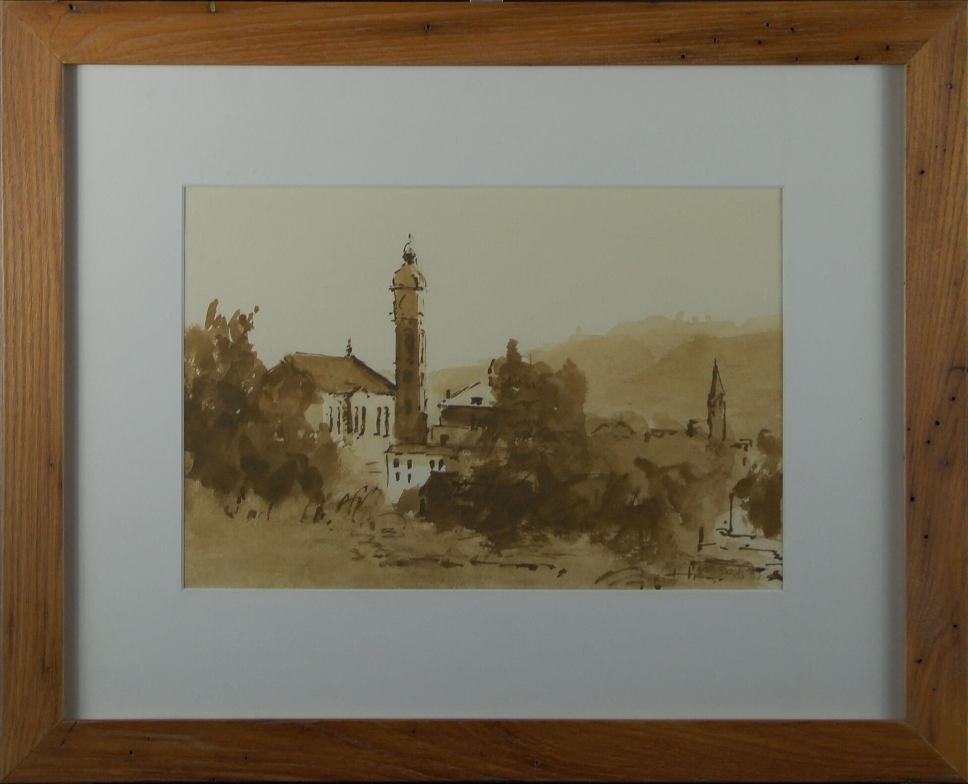 Using brown washes and densities of paint and ink, Shils painted a European village set against a hilly background. A tall tower extends upward silhouetted against the cream- color sky. Trees and bushes, painted with quick strokes fill the spaces in between buildings.Artwork Details
