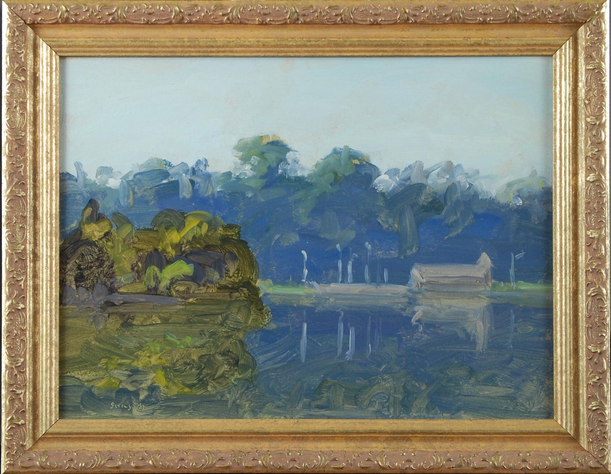 While the paint application is thin, the artist allowed viewers to see the expressionist brushwork of mottled and mixed colors. Predominantly blue (pale in the sky, deeper in the water and shadows on the trees on the opposite shore), the yellow, green and black bushes on the left all reflect in the body of water that filles the lower third of the canvas.Artwork Details