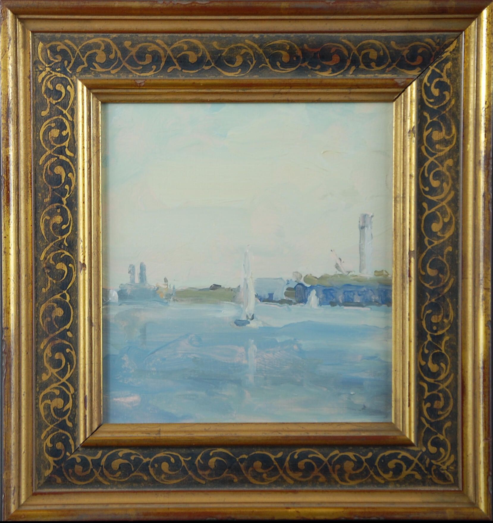 This seascape includes a small sailboat in the center of a sea of light blue and rose water which extends backward to the shore which includes indistinct buildings with tall towers. The composition is concluded with an even paler blue sky overhead. The images are conveyed with quick brushwork and little detail.Dimensions
