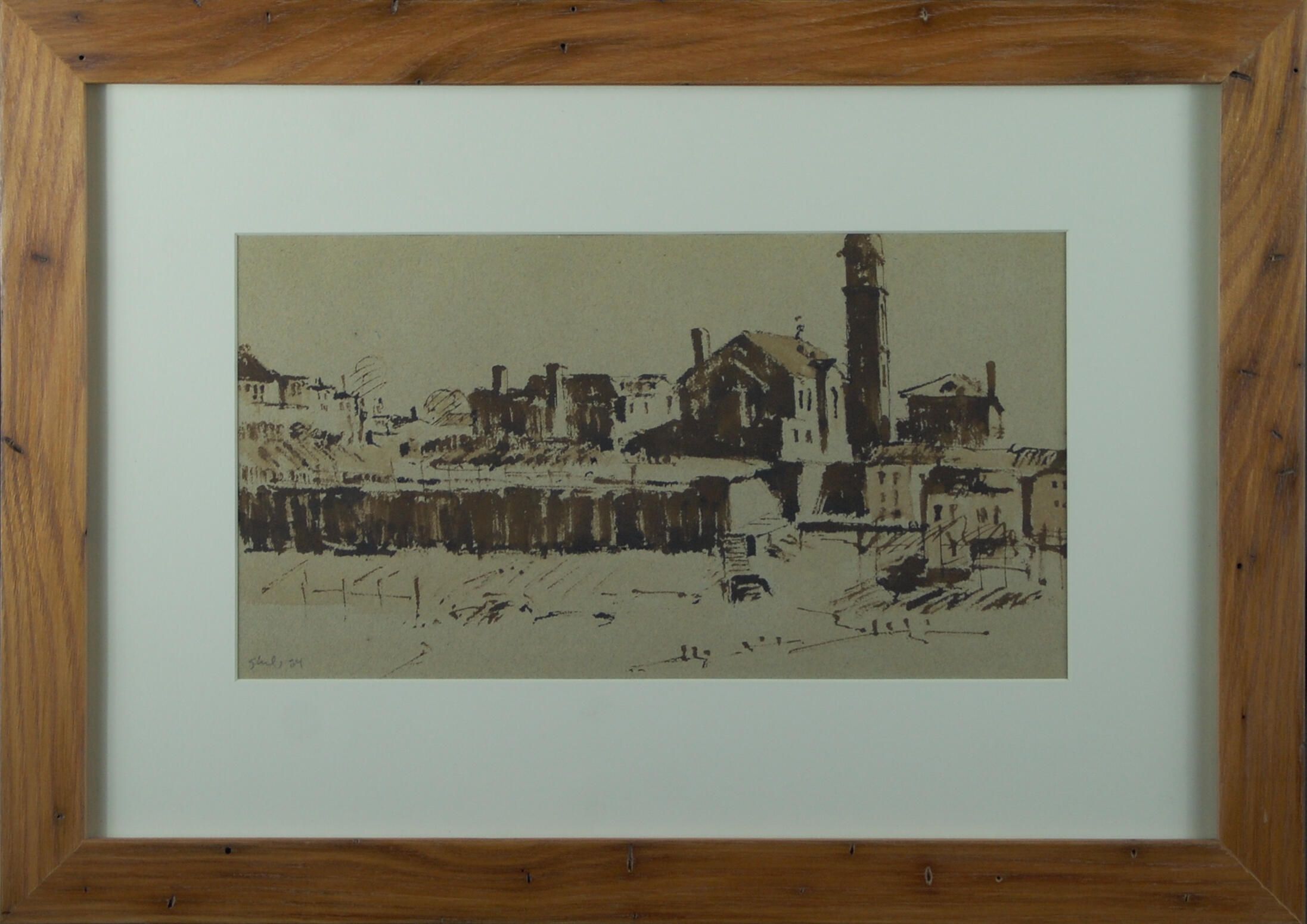 Using brown washes and varying densities of paint, the artist rendered a horizontal scene of a series of buildings, likely on a seashore. On the right a large building (church) stands next to a bell tower.Artwork Details