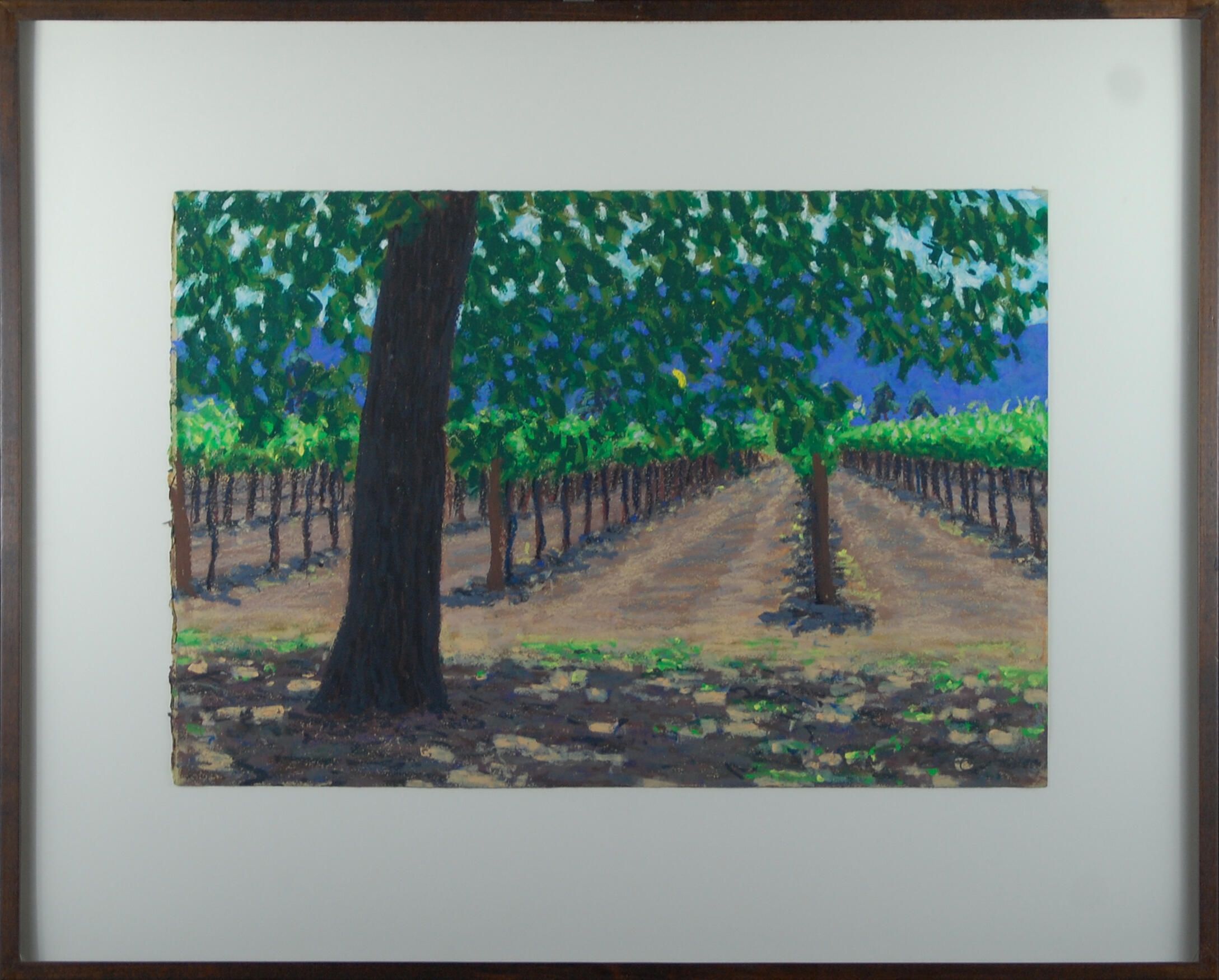In this rural landscape, the artist depicted rows of grape vines with narrow trunks and green leaves behind a larger tree in the foreground.Dimensions