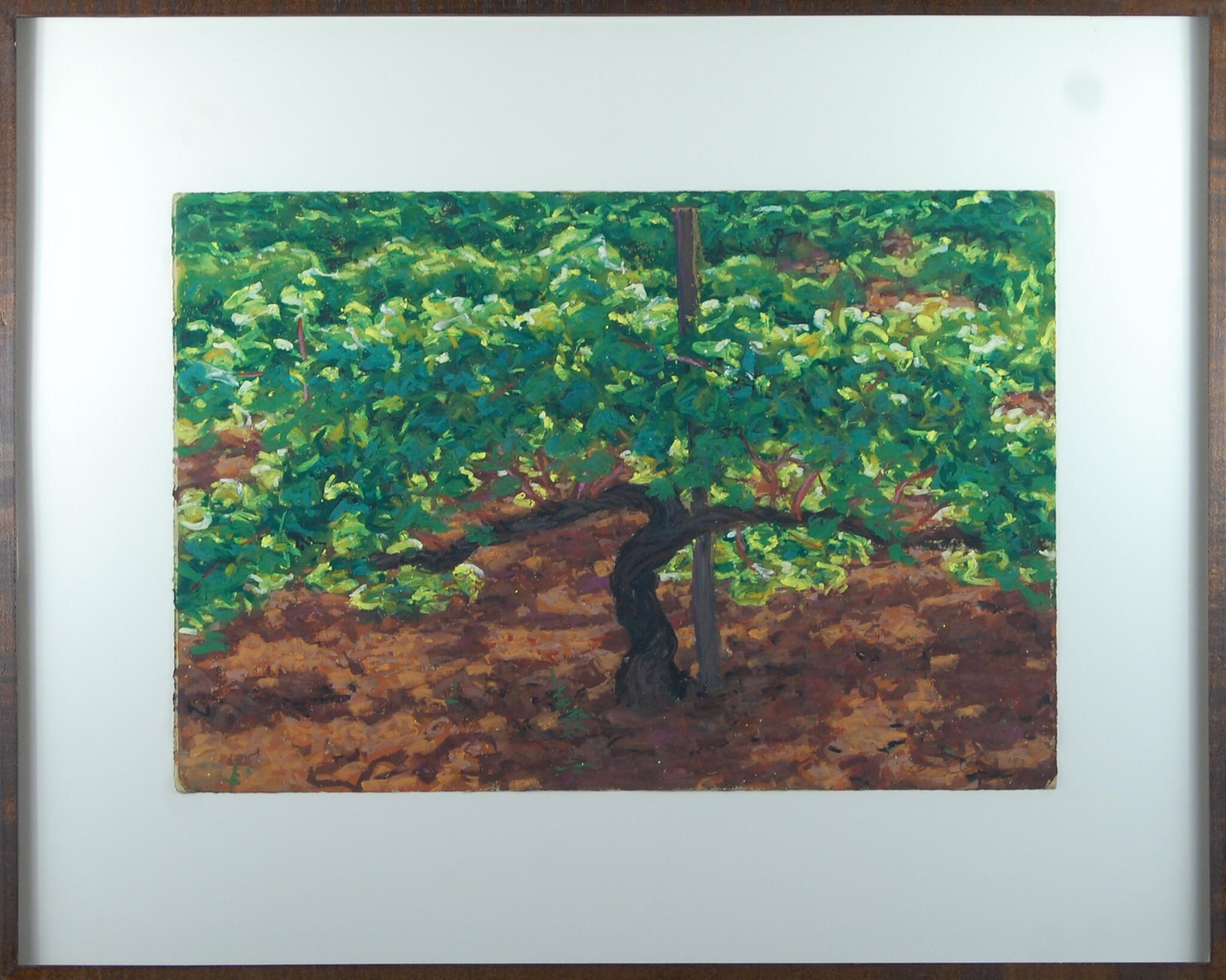 The artist depicted a grape plant in full leafy multi-green bloom surrounded by other similar plants. The leaves are attached to a central winding dark brown "stem" which emerges from the orange-brown land beneath it.Artwork Details
