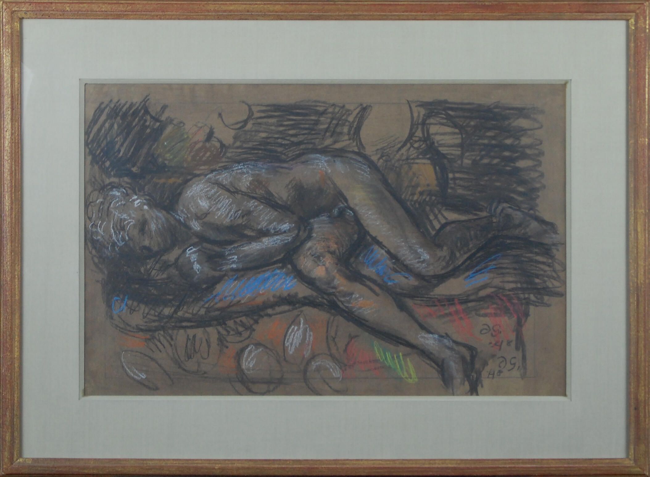 This sleeping male nude is shown lying on his right side, facing the viewer against a background of black lines creating patterns with hatching. The figure lies on a colored bed of red, green, blue and white. The figure is rendered in black with lines and shading white chalk highlights. Based on other works of the period, the model for this work was likely Paul Roche.Artwork Details