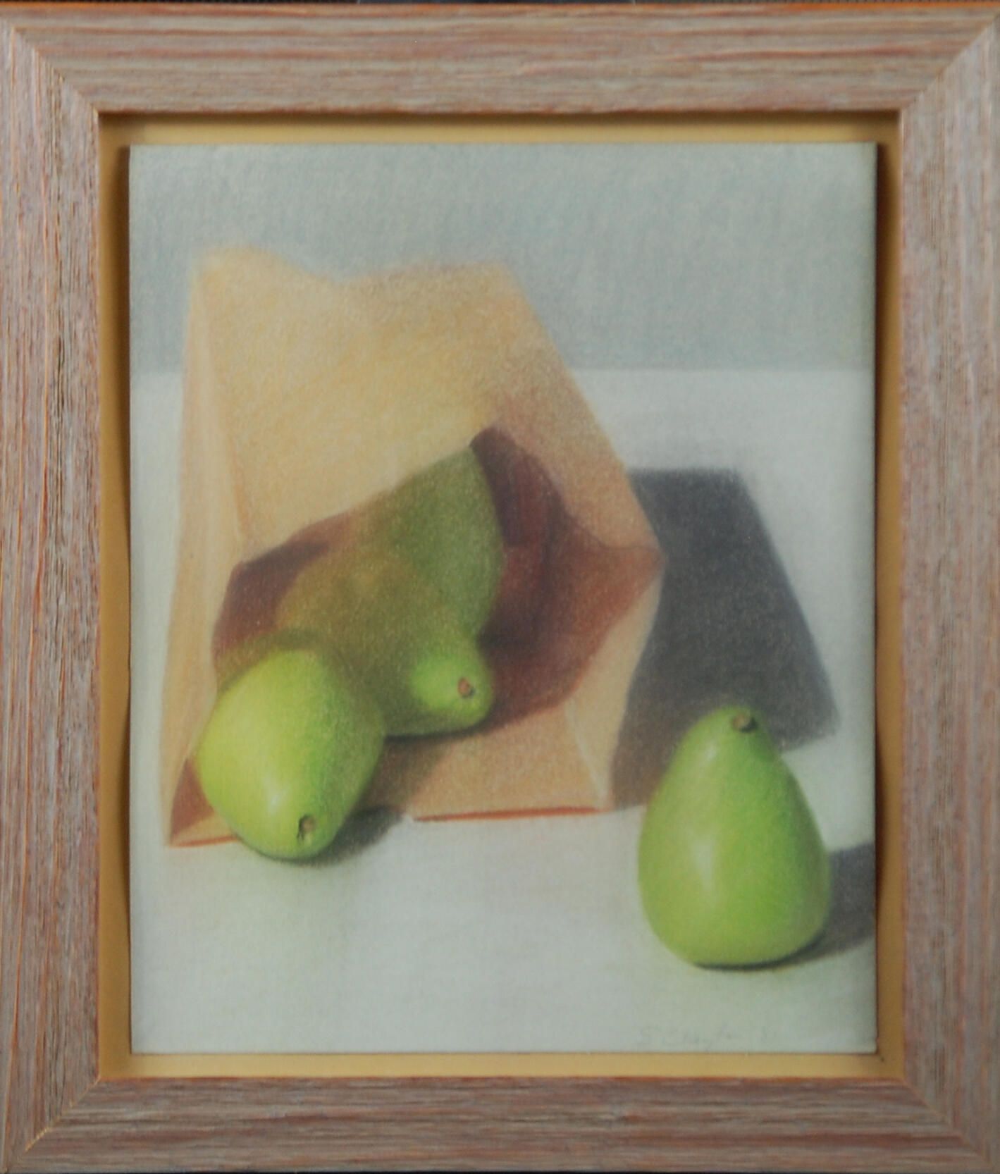 Three pears fall forward toward the picture plane from the inside of a brown paper shopping bag. One already sits upright on the grey surface. The bag casts a dark shadow. The composition is shown against a medium grey wall.Dimensions