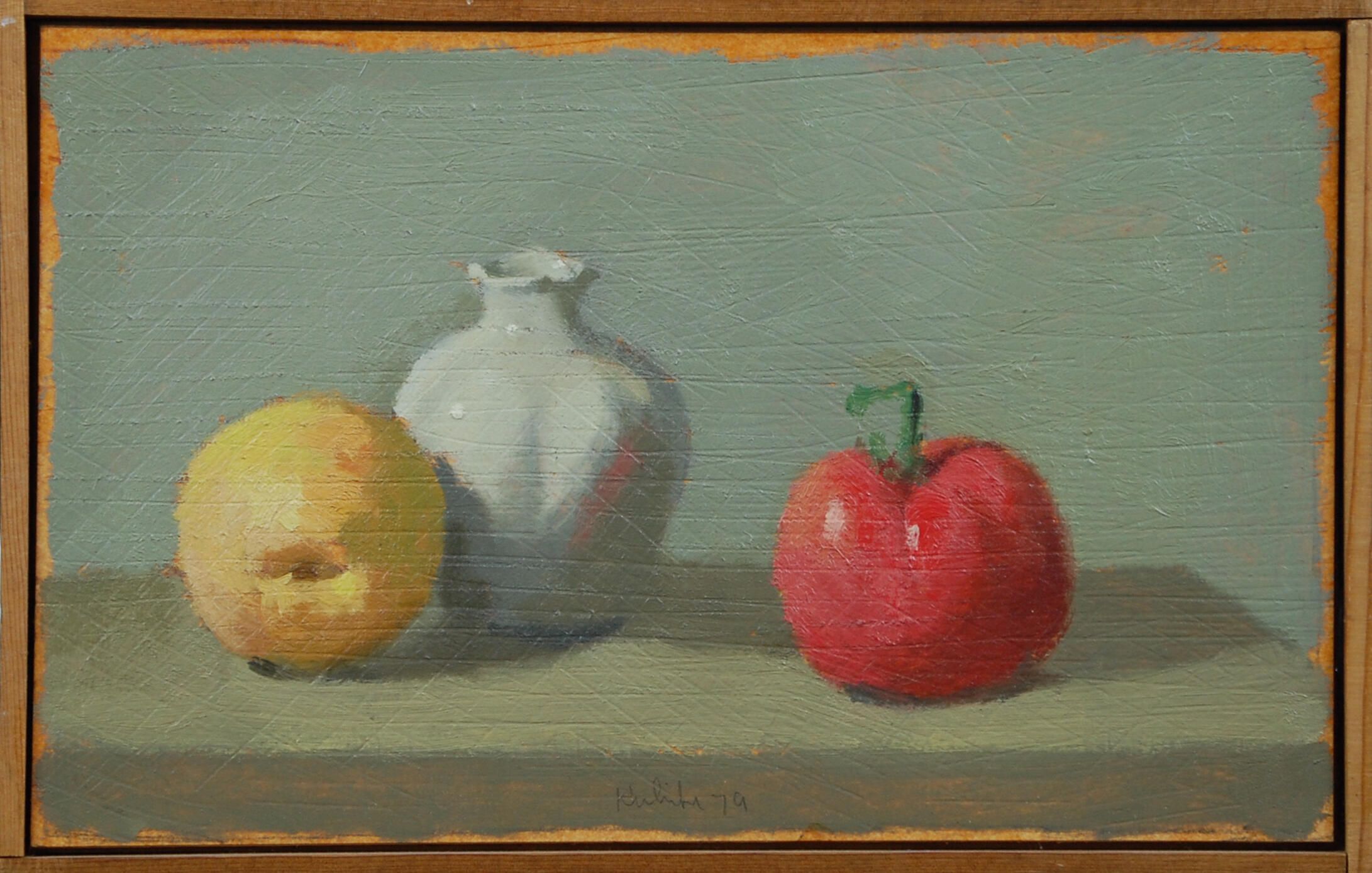 A peach, a tomato and a white Sung jar sit on a pale green shelf (or table top) against a grey-green background. Brushwork is evident as is the texture of the board in this painting which is a study of shadows and reflected light on rounded forms. In my conclusion I took into account the scrape on the painting.Artwork Details