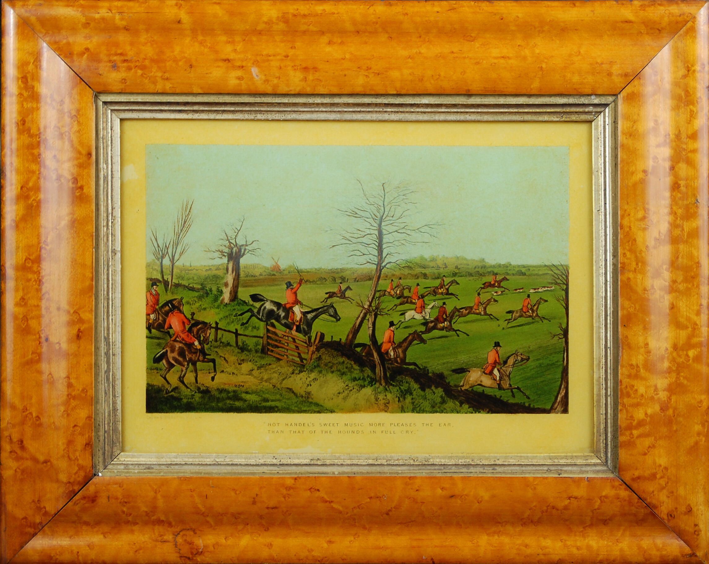 These works are typical of those of Alken who often produced prints of sporting scenes in series of four or six of horses and riders in landscapes of rolling green hills, such as the subject properties. They often show similar horses in the sequence in the course of a hunt. The painting on the glass that covers the images intensified the blue skies and the greens of the ground and hills.Dimensions