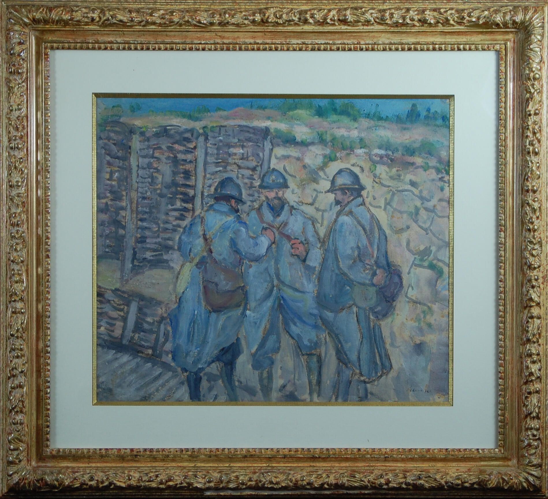 In a palette typical of Lebasque, pastel tones of beiges, pinks, and pale blues, the artist has depicted three WWI soldiers standing near fortifications: a stone wall to the (viewer's) right and a barricade on the left, providing a pattern of horizontal lines. In the distance and overhead is a bright blue sky above green plants on the landscape. The three soldiers are the subjects of this work in their helmets, uniforms and carrying packs. They stand in a small group on planks facing each other.Artwork Details
