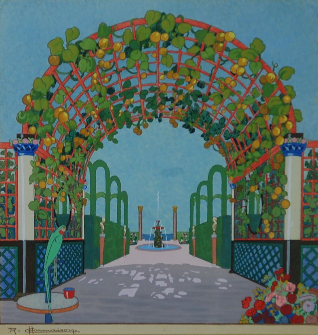 Description: Eight brightly colored full-page plates of imaginary garden views compose the portfolio. Plate 1titled ""La Salle Verte" depicts a Roman garden with pool, flowers, and columns. Plate 2, "Les Flo," depicts a covered walk along the seashore. In Plate 3, "La Jarre," a terracotta pot is the focus of a brightly-colored flower Mediterranean garden. Plate 4, "L'Allee Rouge," depicts an Oriental garden with iris, walkway, a bridge and trees. Plate 5, "L'Atrium," shows a garden with fountain, potted trees and cushions. Plate 6, "Le Berceau," depicts a lush covered berceau (cradle) with tropical fruit. Plate 7, "La Charmille," depicts a green gateway into a hortus inclusis. And Plate 8, "La Creille Rose," depicts a night-time view of wisteria and roses on a trellis under the stars.Dimensions
