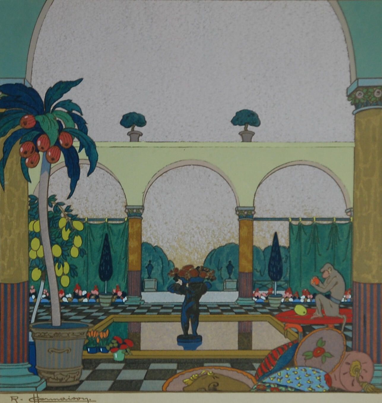 Eight brightly colored full-page plates of imaginary garden views compose the portfolio. Plate 1titled ""La Salle Verte" depicts a Roman garden with pool, flowers, and columns. Plate 2, "Les Flo," depicts a covered walk along the seashore. In Plate 3, "La Jarre," a terracotta pot is the focus of a brightly-colored flower Mediterranean garden. Plate 4, "L'Allee Rouge," depicts an Oriental garden with iris, walkway, a bridge and trees. Plate 5, "L'Atrium," shows a garden with fountain, potted trees and cushions. Plate 6, "Le Berceau," depicts a lush covered berceau (cradle) with tropical fruit. Plate 7, "La Charmille," depicts a green gateway into a hortus inclusis. And Plate 8, "La Creille Rose," depicts a night-time view of wisteria and roses on a trellis under the stars.Dimensions