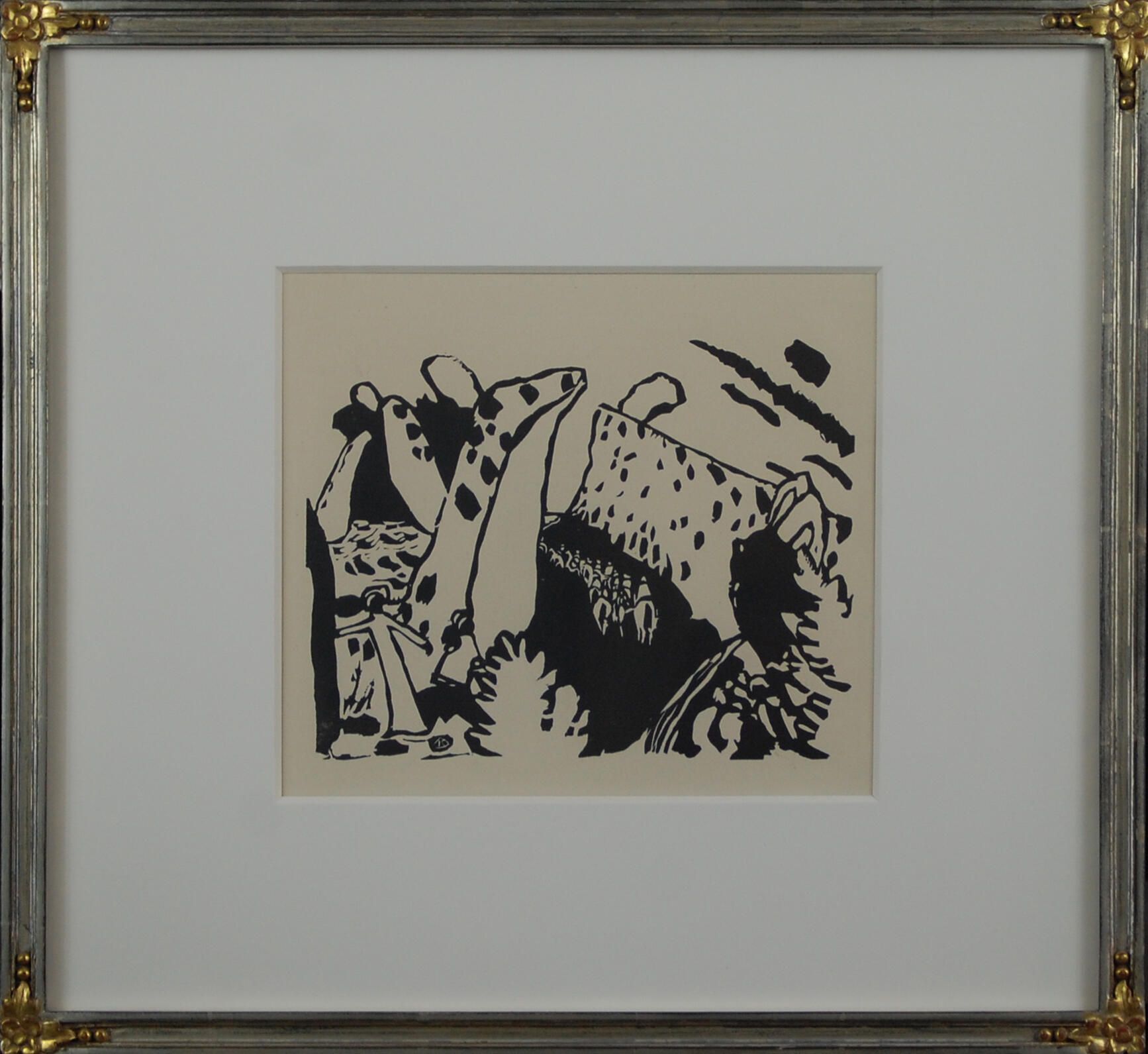 This work strongly resembles the painting Der Blau Reiter, in composition and forms. Recreated in black, Kandinsky uses some of the same forms and subjects, such as the line of horses and the vertical projections on the left. The procession walks along the "rider's path," the title of the print.Dimensions