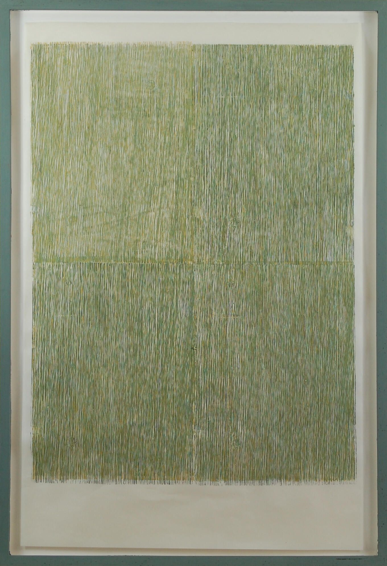 Dense lines that were cut into the wood matrix have been transferred to the paper support filling the image with tones of green linear patterns.