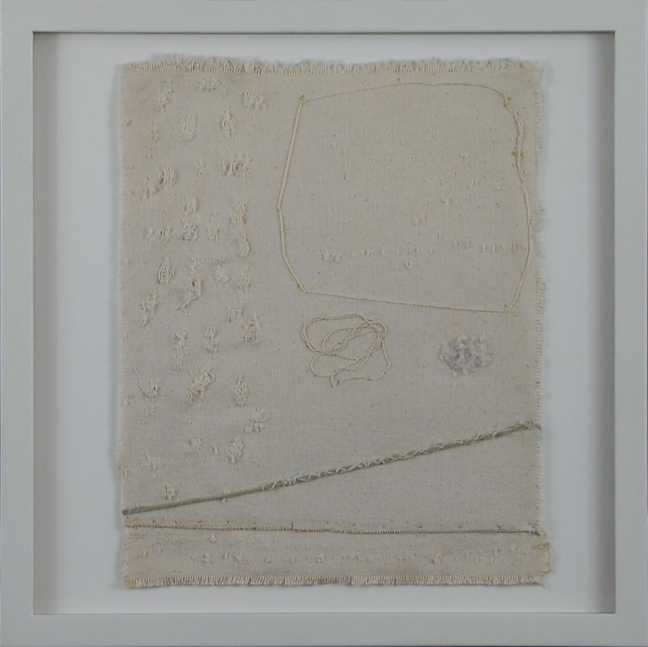 This work features a cutting of raw canvas with different surface features. An applied piece of square canvas with rounded comers is adhered to the bottom composition. Other elements of the work include threads on the left, a pile of thread in the center, a long diagonal strand of fabric towards the bottom, some stich-like features and fraying at the bottom. The borders of the canvas are frayed.Artwork Details
