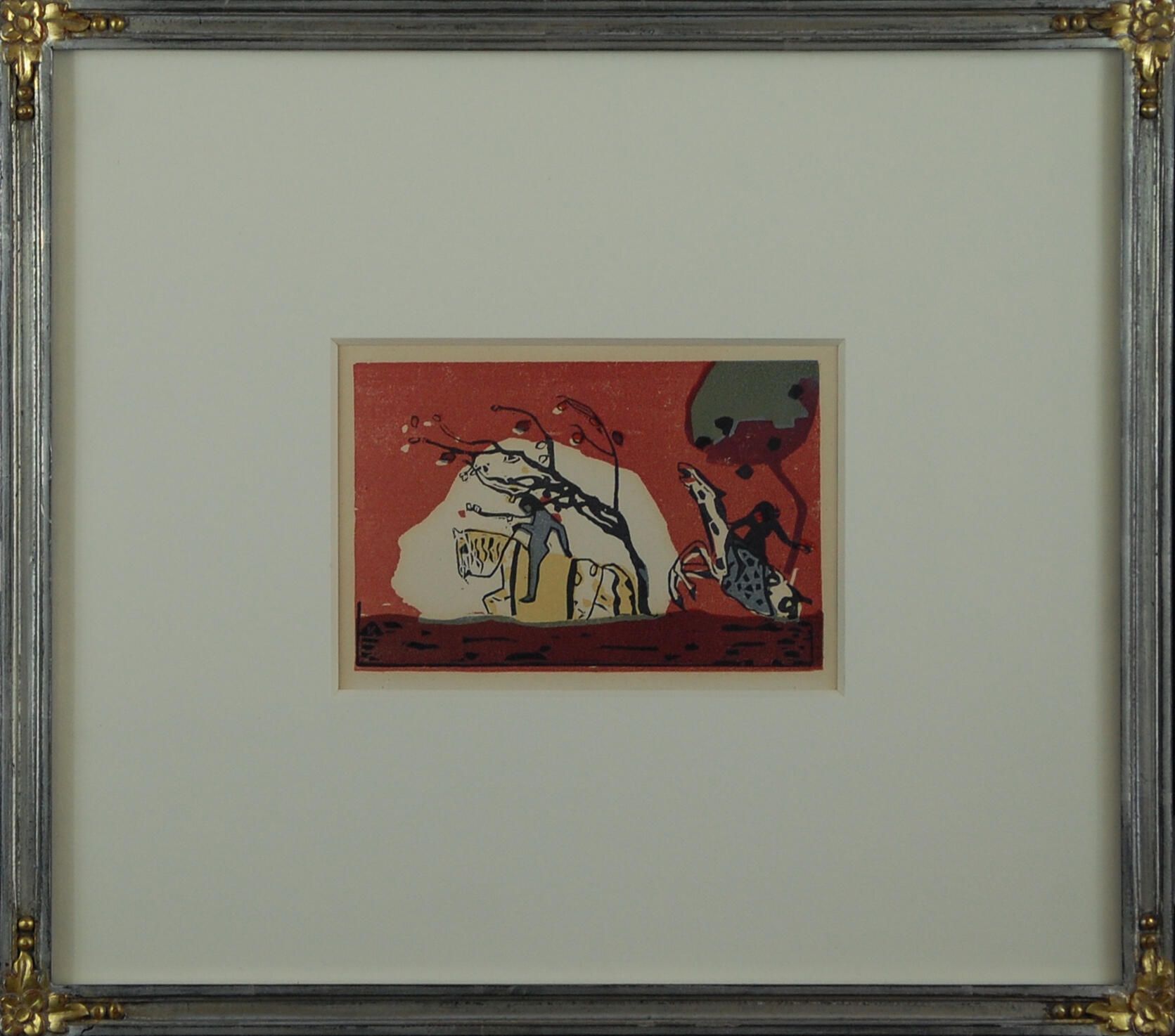 From the 1938 publication of Klange, this work follows the theme of Der Blaue Reiter with two prominent figures on horseback below two trees. The front rider sits on a light colored, spotted horse partially covered with a yellow blanket. The rider on the rear horse sits on a blue blanket. Both are shown against a red ground with a white erose circle in the center. The tree on the right has a large green top. The tree in the center of the image has blossoms on spindly branches.The first edition of 300 prints of Klange was released in 1913. The second edition of 1200 was published in 1938.Dimensions