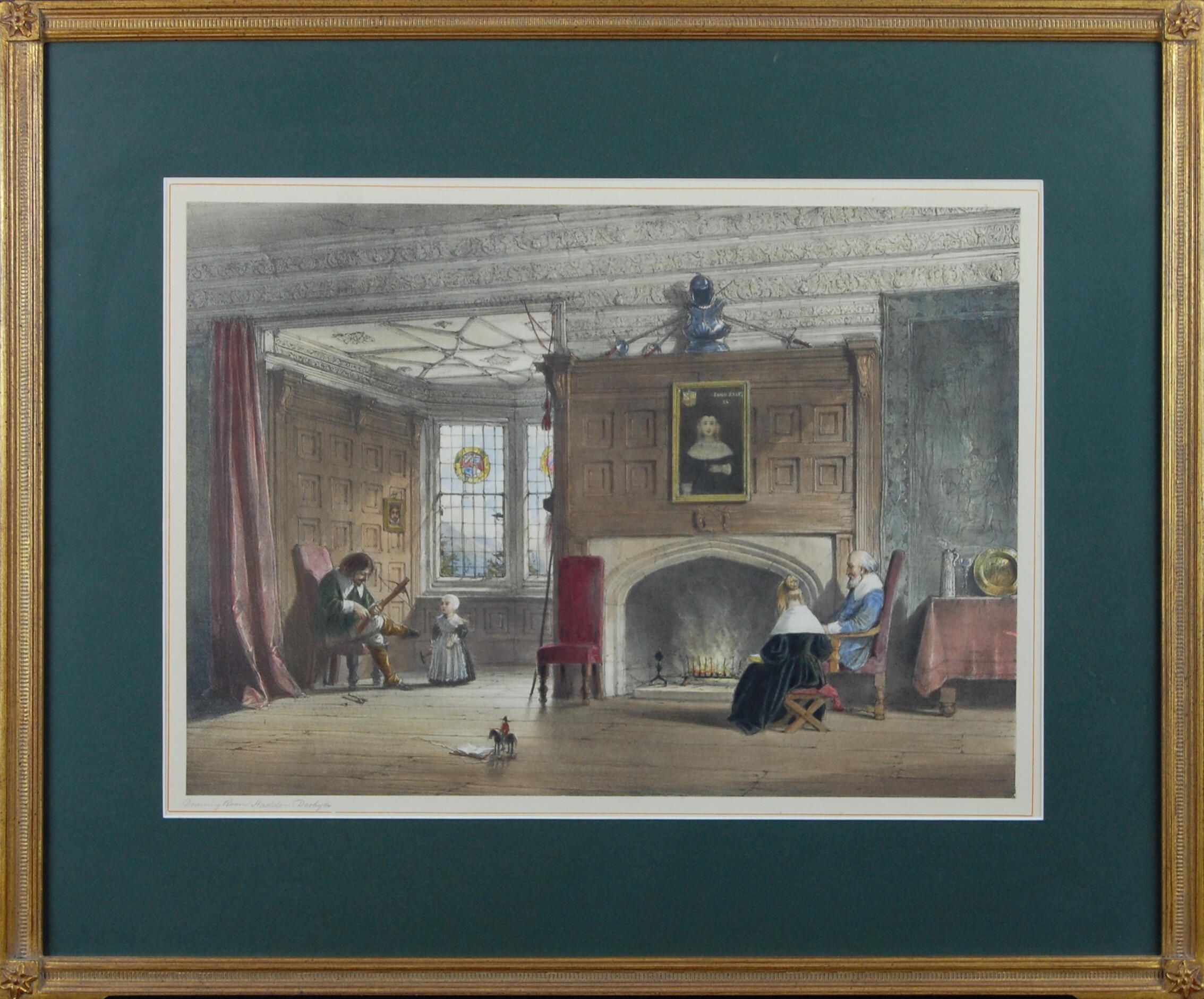 The four prints in this collection portray the interiors of grand homes in England. The works are detailed scenes showing realistic decor, wall coverings, and furniture.Artwork Details