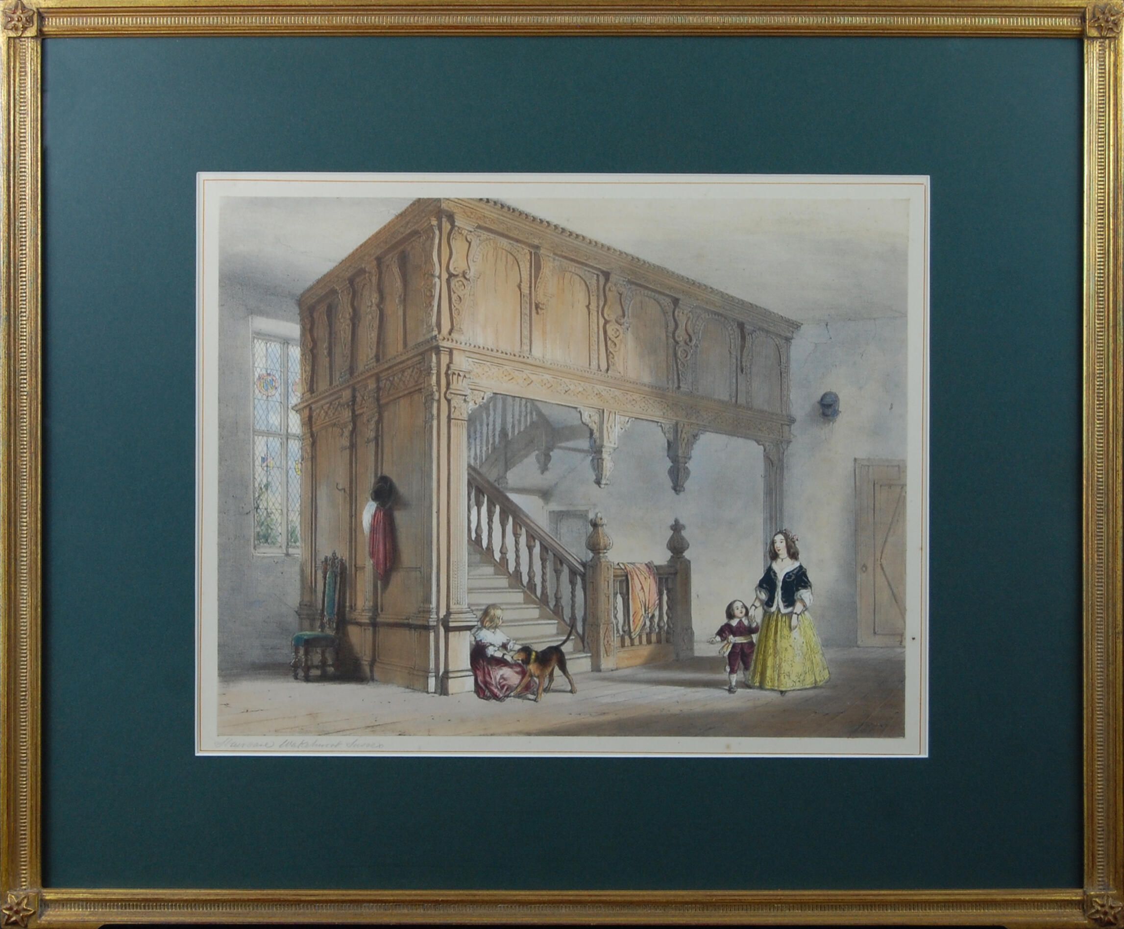 The four prints in this collection portray the interiors of grand homes in England. The works are detailed scenes showing realistic decor, wall coverings, and furniture.Artwork Details
