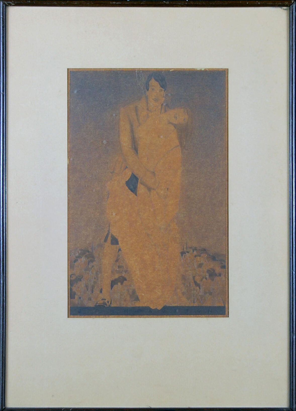 This work shows two figures, a man embracing a woman leaning to the right, posed in front of a gesturally rendered background. The two figures are centered and fill the space vertically. There are incised lines and writing on the bottom on the front of the work that reads:"John AVE EN"Dimensions