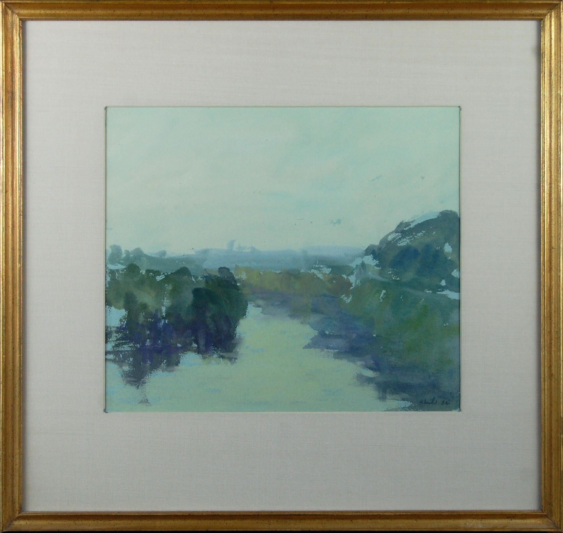 Soft watercolor tones of blue and green fill this hazy seascape A body of water begins in the front of the picture plane, moving backward toward the horizon.Dimensions